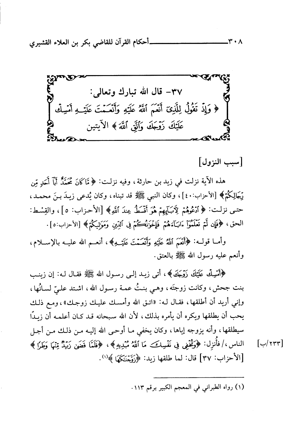 ٣٧ - قال اللَّه تبارك وتعالى: {وَإِذْ تَقُولُ لِلَّذِي أَنْعَمَ اللَّهُ عَلَيْهِ وَأَنْعَمْتَ عَلَيْهِ أَمْسِكْ عَلَيْكَ زَوْجَكَ وَاتَّقِ اللَّهَ} الآيتين