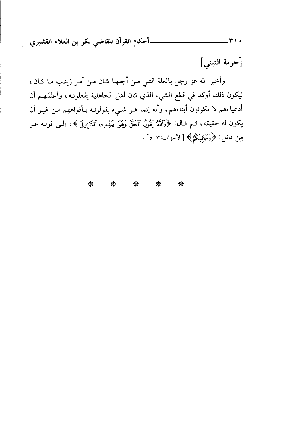 وأخبر اللَّه عز وجل بالعلة التي من أجلها كان من أمر زينب ما كان، ليكون ذلك أوكد في قطع الشيء الذي كان أهل الجاهلية يفعلونه، وأعلمَهم أن أدعياءهم لا يكونون أبناءهم، وأنه إنما هو شيء يقولونه بأفواههم من غير أن يكون له حقيقة، ثم قال: {وَاللَّهُ يَقُولُ الْحَقَّ وَهُوَ يَهْدِي السَّبِيلَ}، إلى قوله عز مِن قائل: {وَمَوَالِيكُمْ} [الأحزاب: ٣ - ٥].