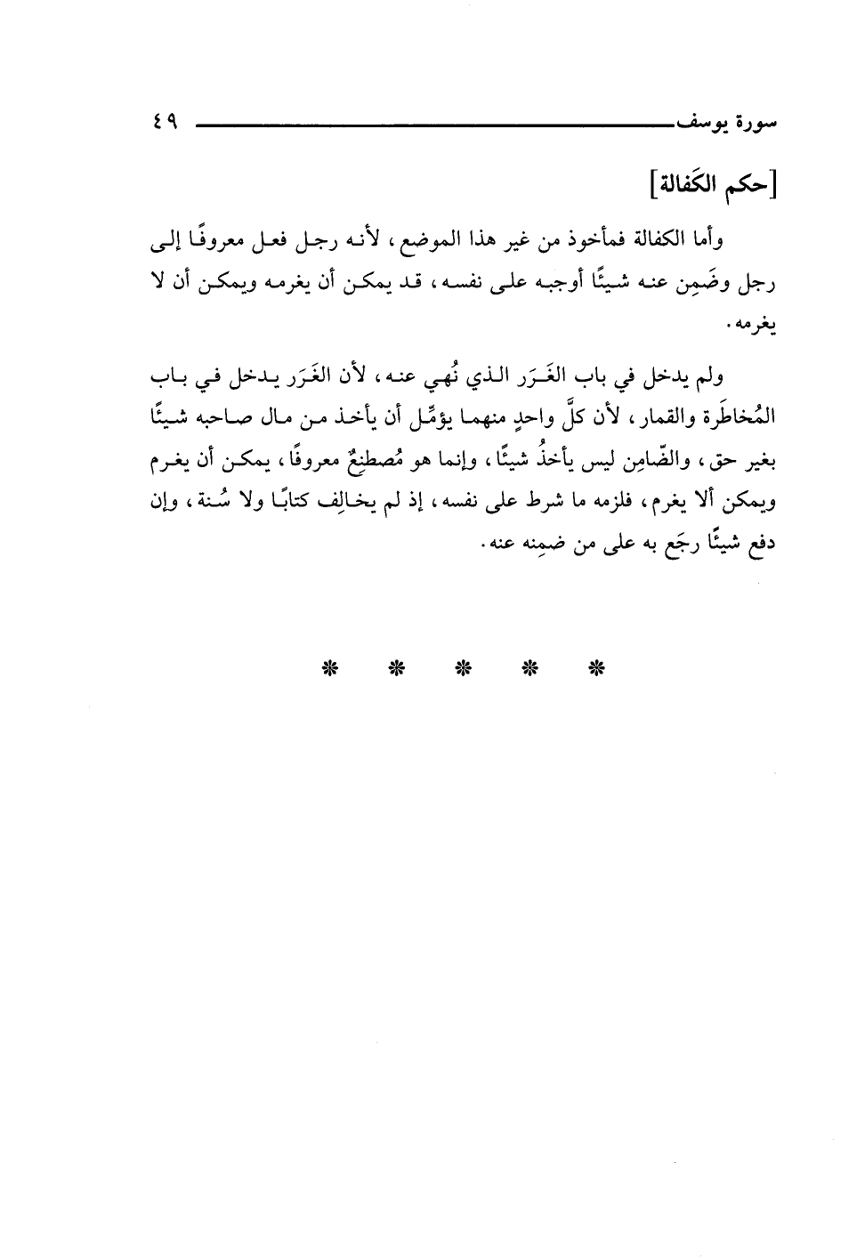 وأما الكفالة فمأخوذ من غير هذا الموضع، لأنه رجل فعل معروفًا إلى رجل وضَمِن عنه شيئًا أوجبه على نفسه، قد يمكن أن يغرمه ويمكن أن لا يغرمه.