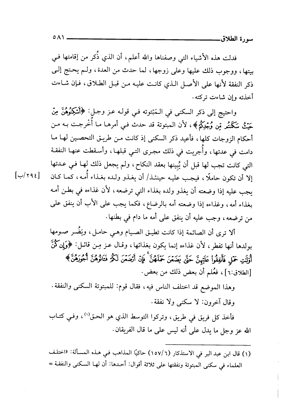 واحتيج إلى ذكر السكنى في المَبْتوته في قوله عز وجل: {أَسْكِنُوهُنَّ مِنْ حَيْثُ سَكَنْتُمْ مِنْ وُجْدِكُمْ}، لأن المبتوتة قد حدث في أمرها ما أُخْرجت به من أحكام الزوجات كلها، فأعيد ذكر السكنى إذ كانت من طريق التحصين لها ما دامت في عدتها، وأُجريت في ذلك مجرى التي قبلها، وأسقطت عنها النفقة التي كانت تجب لها قبل أن يُبِينها بعقد النكاح، ولم يجعل ذلك لها في عدتها إلا أن تكون حاملًا، فيجب عليه حينئذ أن يغذو ولده بغذاء أُمه، كما كان يجب عليه إذا وضعته أن يغذو ولده بغذاء التي ترضعه، لأن غذاءه في بطن أمه بغذاء أمه، وغذاءه إذا وضعته أمه بالرضاع، فكما يجب على الأب أن ينفق على من ترضعه، وجب عليه أن ينفق على أمه ما دام في بطنها.