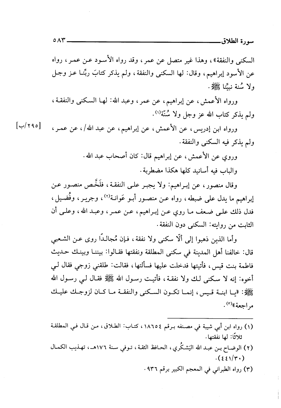 ورواه الأعمش، عن إبراهيم، عن عمر، وعبد اللَّه: لها السكنى والنفقة، ولم يذكر كتاب اللَّه عز وجل ولا سُنّة (¬١).
