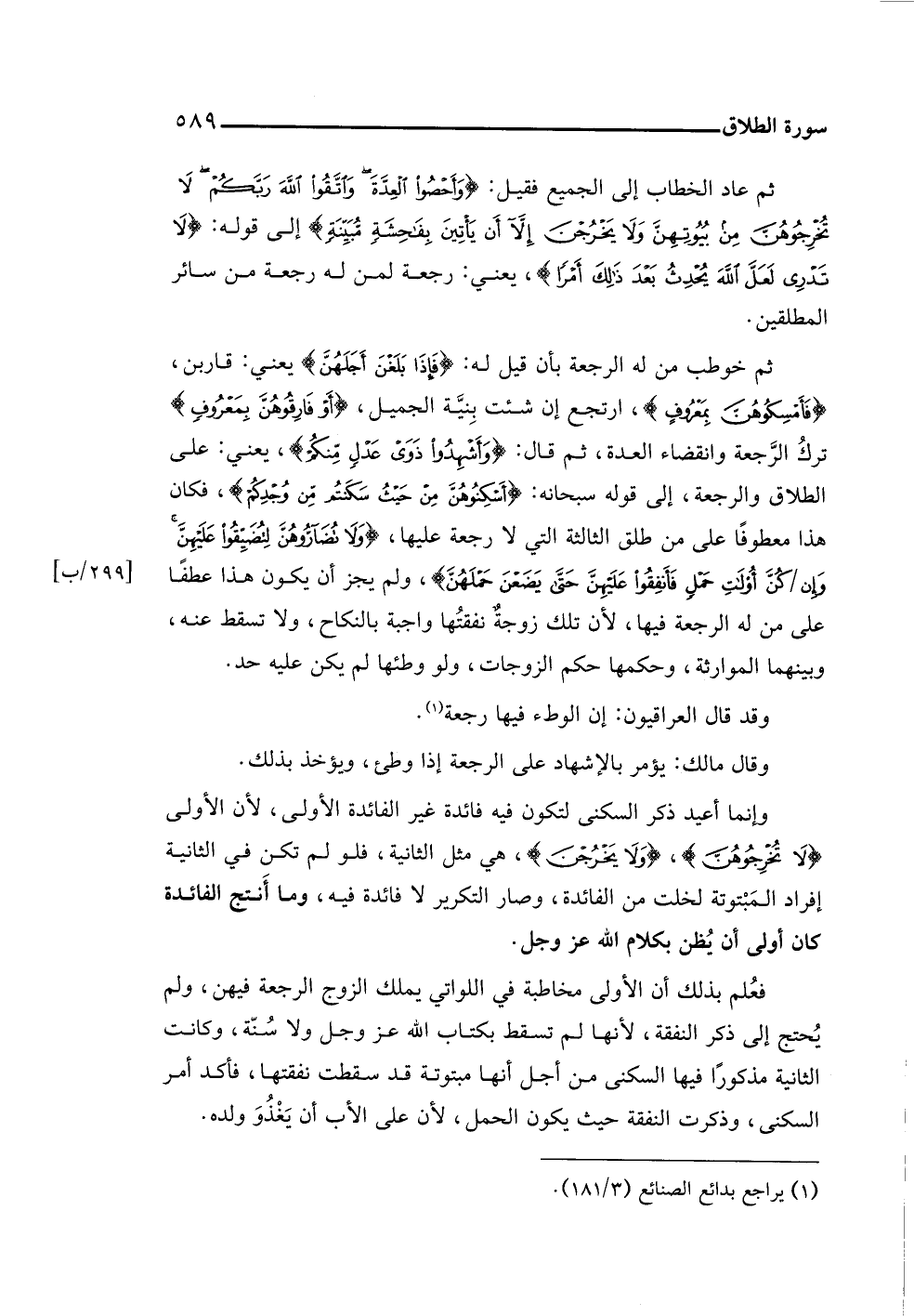 ثم خوطب من له الرجعة بأن قيل له: {فَإِذَا بَلَغْنَ أَجَلَهُنَّ} يعني: قاربن، {فَأَمْسِكُوهُنَّ بِمَعْرُوفٍ}، ارتجع إن شئت بِنيَّة الجميل، {أَوْ فَارِقُوهُنَّ بِمَعْرُوفٍ} تركُ الرَّجعة وانقضاء العدة، ثم قال: {وَأَشْهِدُوا ذَوَيْ عَدْلٍ مِنْكُمْ}، يعني: على الطلاق والرجعة، إلى قوله سبحانه: {أَسْكِنُوهُنَّ مِنْ حَيْثُ سَكَنْتُمْ مِنْ وُجْدِكُمْ}، فكان هذا معطوفًا على من طلق الثالثة التي لا رجعة عليها، {وَلَا تُضَارُّوهُنَّ لِتُضَيِّقُوا عَلَيْهِنَّ وَإِنْ كُنَّ أُولَاتِ حَمْلٍ فَأَنْفِقُوا عَلَيْهِنَّ حَتَّى يَضَعْنَ حَمْلَهُنّ}، ولم يجز أن يكون هذا عطفًا على من له الرجعة فيها، لأن تلك زوجةٌ نفقتُها واجبة بالنكاح، ولا تسقط عنه، وبينهما الموارثة، وحكمها حكم الزوجات، ولو وطئها لم يكن عليه حد.