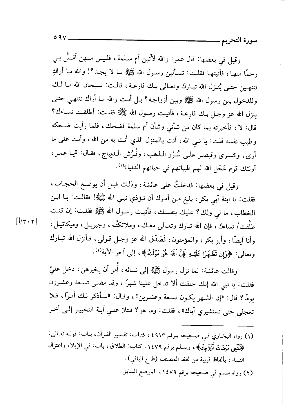 (¬١) رواه البخاري في صحيحه برقم ٤٩١٣، كتاب: تفسير القرآن، باب: قوله تعالى {تَبْتَغِي مَرْضَاتَ أَزْوَاجِكَ}، ومسلم برقم ١٤٧٩، كتاب: الطلاق، باب: في الإيلاء واعتزال النساء، بألفاظ قريبة من لفظ المصنف (ط ع الباقي).