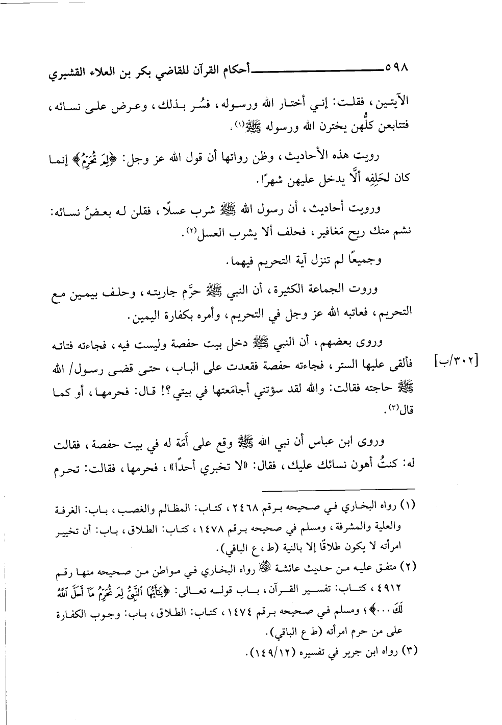 وروى بعضهم، أن النبي -صلى اللَّه عليه وسلم- دخل بيت حفصة وليست فيه، فجاءته فتاته فألقى عليها الستر، فجاءته حفصة فقعدت على الباب، حتى قضى رسول اللَّه -صلى اللَّه عليه وسلم- حاجته فقالت: واللَّه لقد سؤتني أجامَعتها في بيتي؟ ! قال: فحرمها، أو كما قال (¬٣).