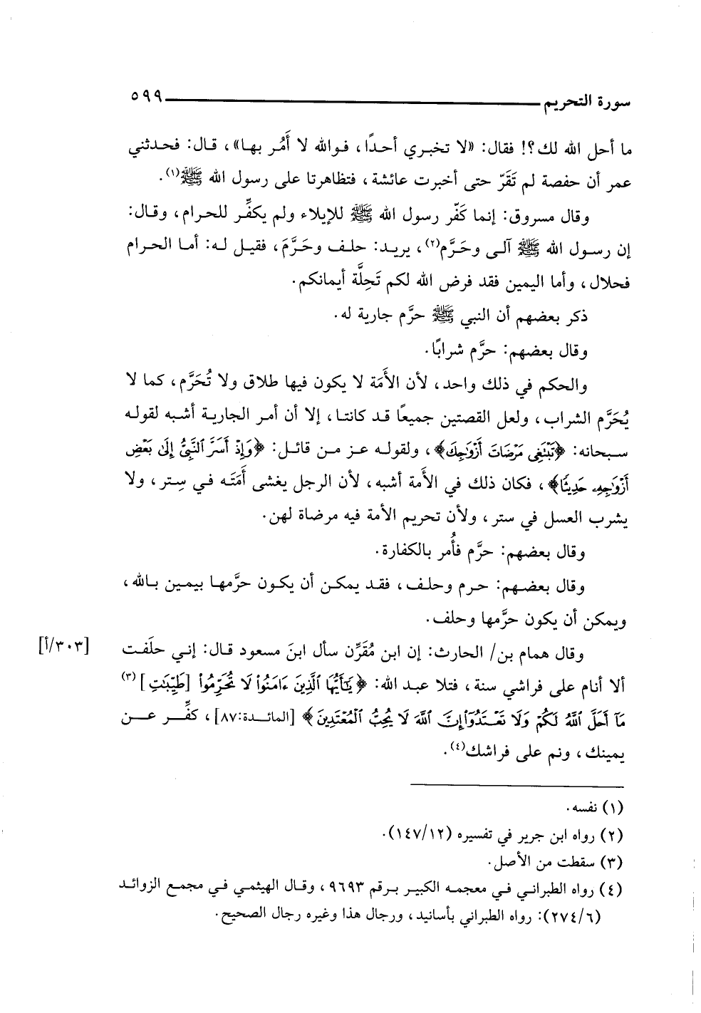 وقال بعضهم: حرم وحلف، فقد يمكن أن يكون حرَّمها بيمين باللَّه، ويمكن أن يكون حرَّمها وحلف.