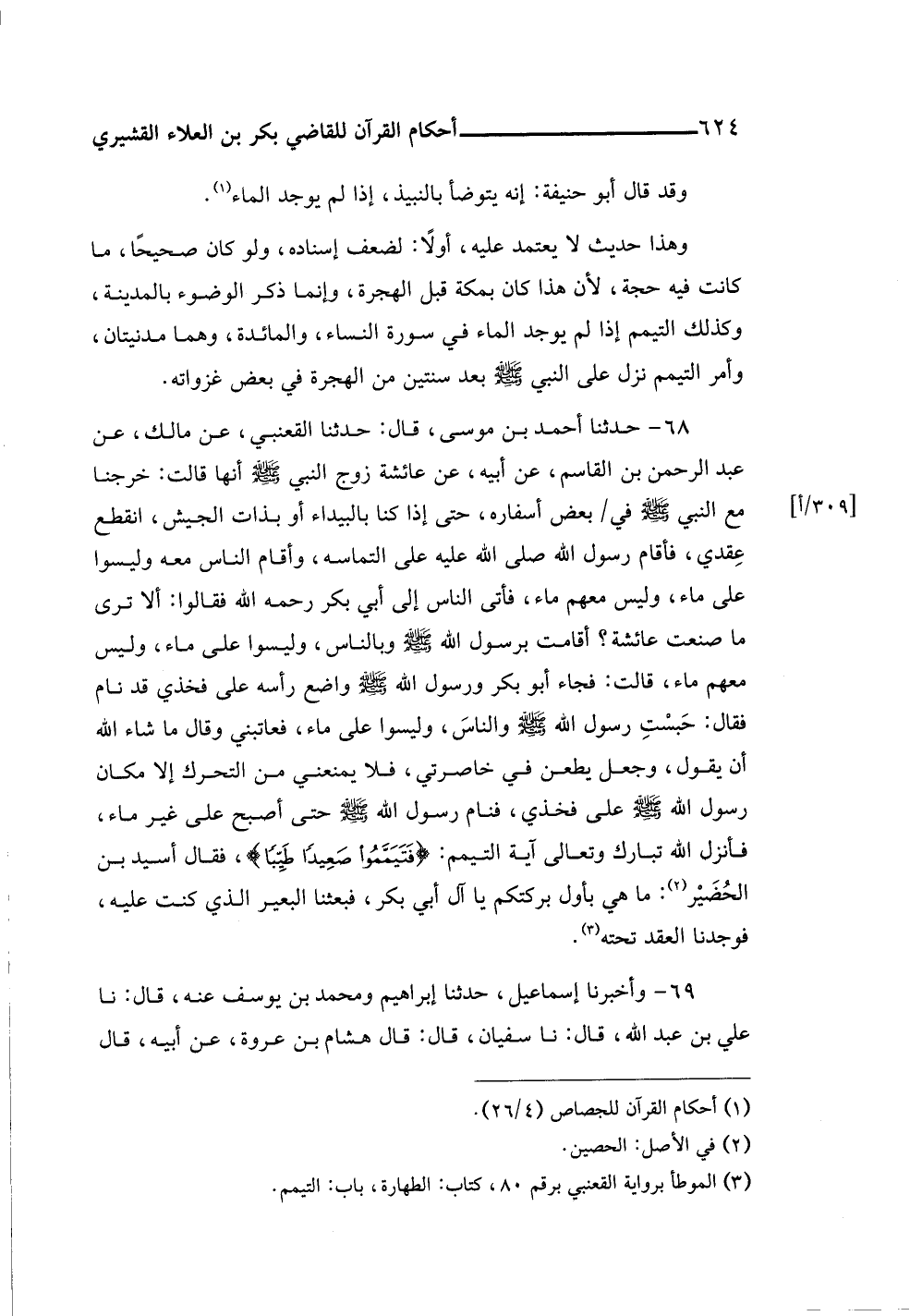 ٦٨ - حدثنا أحمد بن موسى، قال: حدثنا القعنبي، عن مالك، عن عبد الرحمن بن القاسم، عن أبيه، عن عائشة زوج النبي -صلى اللَّه عليه وسلم- أنها قالت: خرجنا مع النبي -صلى اللَّه عليه وسلم- في بعض أسفاره، حتى إذا كنا بالبيداء أو بذات الجيش، انقطع عِقدي، فأقام رسول اللَّه صلى اللَّه عليه على التماسه، وأقام الناس معه وليسوا على ماء، وليس معهم ماء، فأتى الناس إلى أبي بكر رحمه اللَّه فقالوا: ألا ترى ما صنعت عائشة؟ أقامت برسول اللَّه -صلى اللَّه عليه وسلم- وبالناس، وليسوا على ماء، وليس معهم ماء، قالت: فجاء أبو بكر ورسول اللَّه -صلى اللَّه عليه وسلم- واضع رأسه على فخذي قد نام فقال: حَبسْتِ رسول اللَّه -صلى اللَّه عليه وسلم- والناسَ، وليسوا على ماء، فعاتبني وقال ما شاء اللَّه أن يقول، وجعل يطعن في خاصرتي، فلا يمنعني من التحرك إلا مكان رسول اللَّه -صلى اللَّه عليه وسلم- على فخذي، فنام رسول اللَّه -صلى اللَّه عليه وسلم- حتى أصبح على غير ماء، فأنزل اللَّه تبارك وتعالى آية التيمم: {فَتَيَمَّمُوا صَعِيدًا طَيِّبًا}، فقال أسيد بن الحُضَيْر (¬٢): ما هي بأول بركتكم يا آل أبي بكر، فبعثنا البعير الذي كنت عليه، فوجدنا العقد تحته (¬٣).
