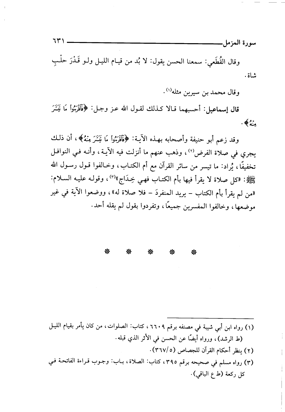 وقد زعم أبو حنيفة وأصحابه بهذه الآية: {فَاقْرَءُوا مَا تَيَسَّرَ مِنْهُ}، أن ذلك يجري في صلاة الفرض (¬٢)، وذهب عنهم ما أنزلت فيه الآية، وأنه في النوافل تخفيفًا، يُراد: ما تيسر من سائر القرآن مع أم الكتاب، وخالفوا قول رسول اللَّه -صلى اللَّه عليه وسلم-: "كل صلاة لا يقرأ فيها بأم الكتاب فهي خِدَاج" (¬٣)، وقوله عليه السلام: "من لم يقرأ بأم الكتاب -يريد المنفردَ- فلا صلاة له"، ووضعوا الآية في غير موضعها، وخالفوا المفسرين جميعًا، وتفردوا بقول لم يقله أحد.