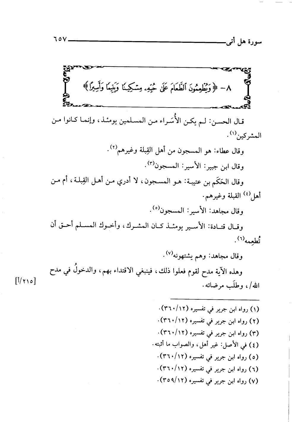 وقال قتادة: الأسير يومئذ كان المشرك، وأخوك المسلم أحق أن تُطعِمه (¬٦).