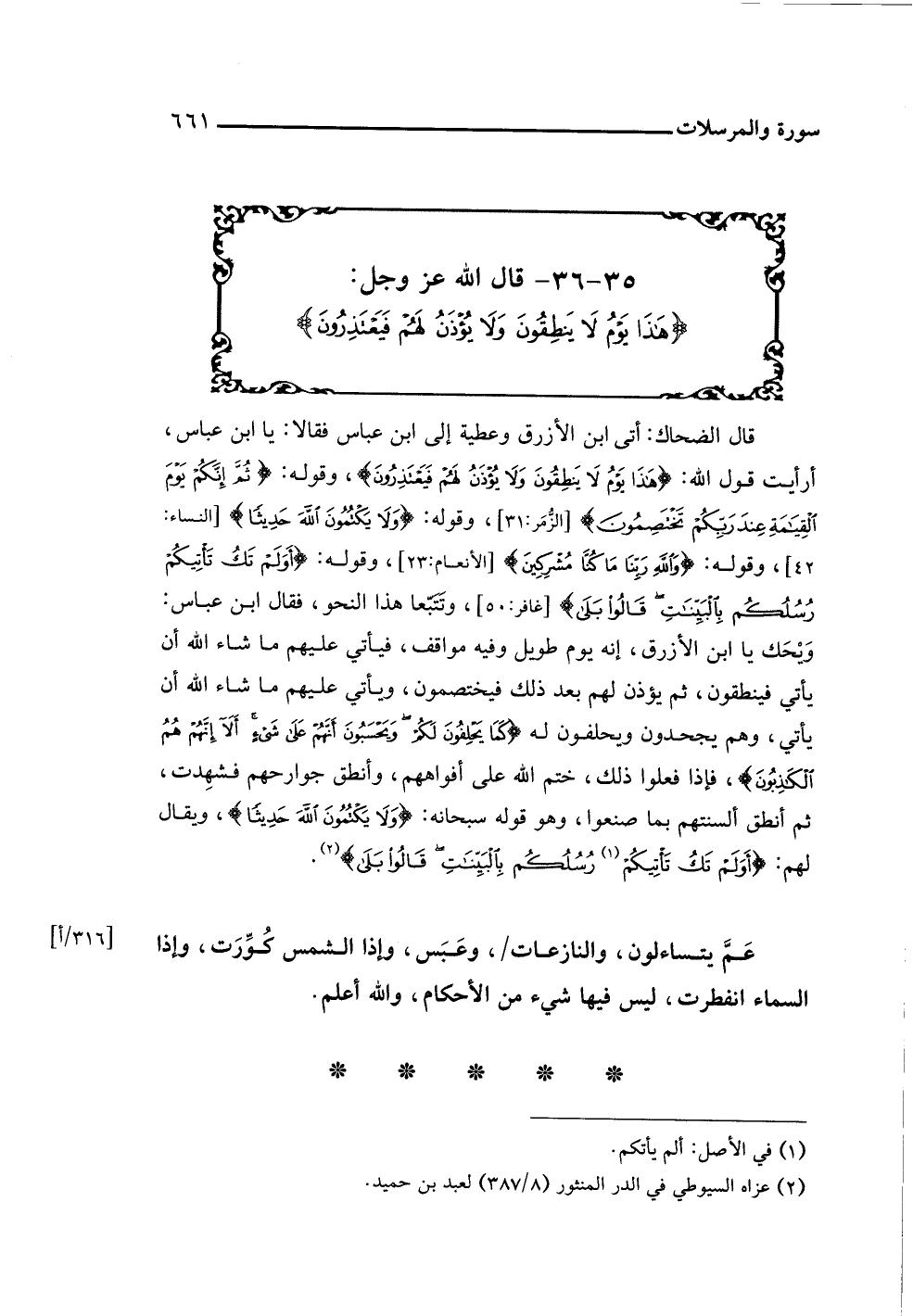 ٣٥ - ٣٦ - قال اللَّه عز وجل: {هَذَا يَوْمُ لَا يَنْطِقُونَ وَلَا يُؤْذَنُ لَهُمْ فَيَعْتَذِرُونَ}