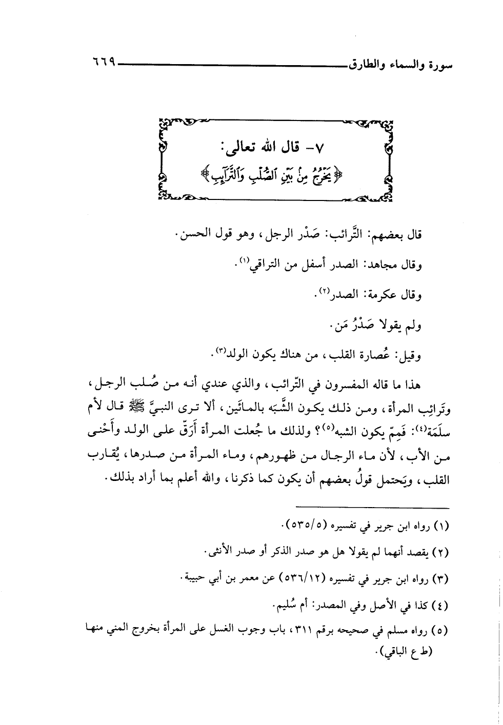 ٧ - قال اللَّه تعالى: {يَخْرُجُ مِنْ بَيْنِ الصُّلْبِ وَالتَّرَائِبِ}