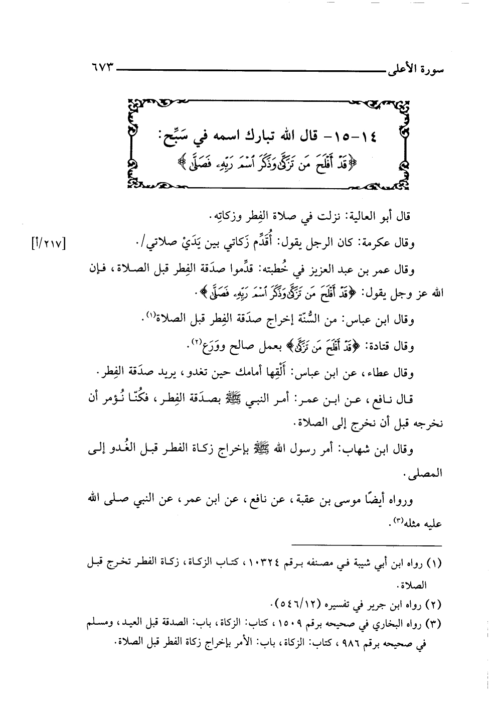 وقال عمر بن عبد العزيز في خُطبته: قدِّموا صدَقة الفِطر قبل الصلاة، فإن اللَّه عز وجل يقول: {قَدْ أَفْلَحَ مَنْ تَزَكَّى وَذَكَرَ اسْمَ رَبِّهِ فَصَلَّى}.