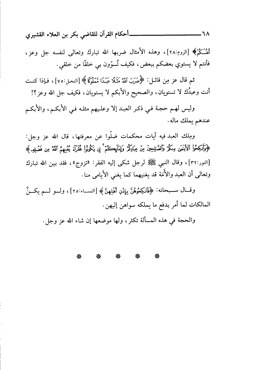 ومِلك العبد فيه آيات محكمات ضلّوا عن معرفتها، قال اللَّه عز وجل: {وَأَنْكِحُوا الْأَيَامَى مِنْكُمْ وَالصَّالِحِينَ مِنْ عِبَادِكُمْ وَإِمَائِكُمْ إِنْ يَكُونُوا فُقَرَاءَ يُغْنِهِمُ اللَّهُ مِنْ فَضْلِهِ} [النور: ٣٢]، وقال النبي -صلى اللَّه عليه وسلم- لرجل شكى إليه الفقر: "تزوج"، فقد بين اللَّه تبارك وتعالى أن العبد والأَمَة قد يغنيهما كما يغني الأيامى منا.