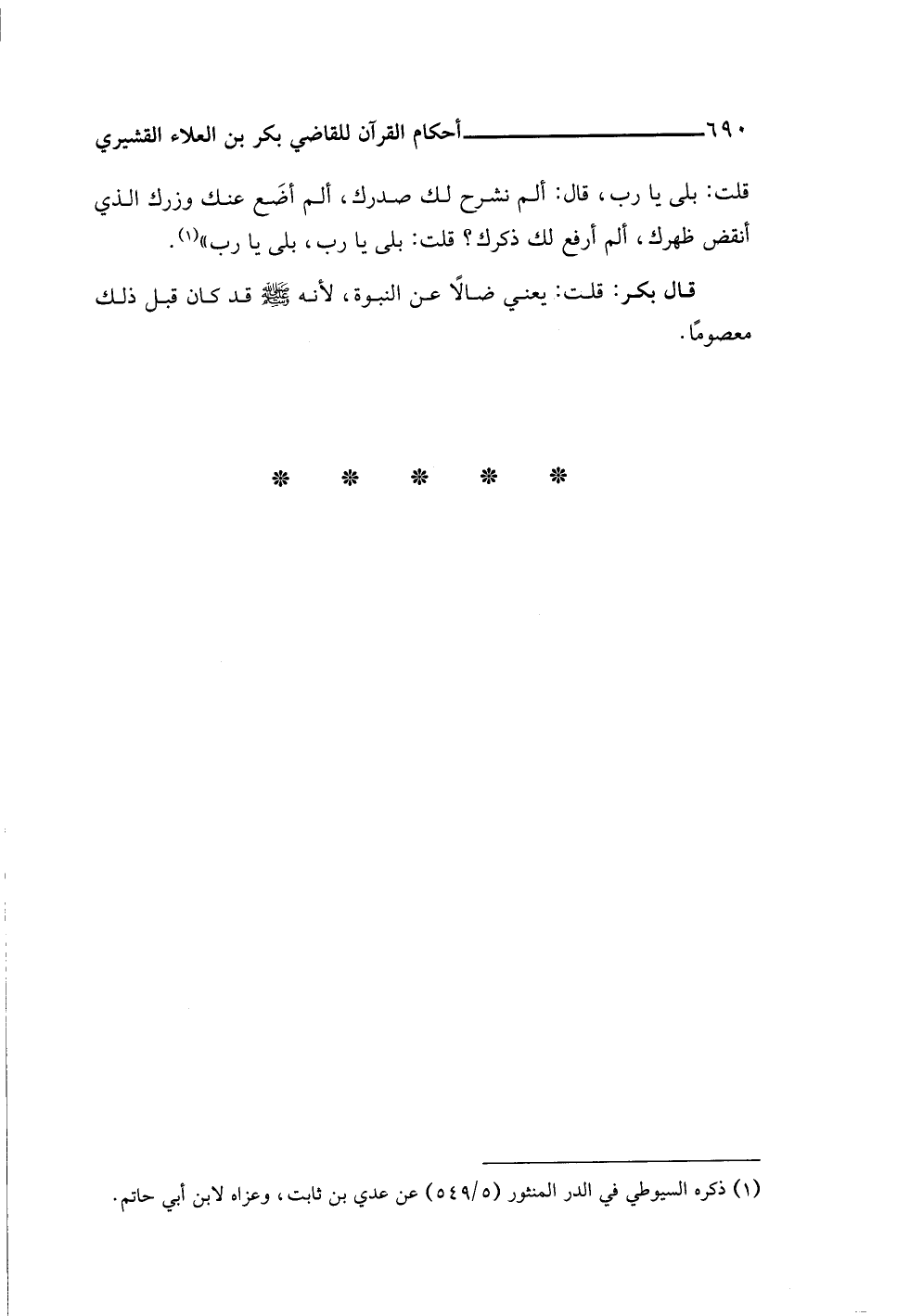 قال بكر: قلت: يعني ضالًا عن النبوة، لأنه -صلى اللَّه عليه وسلم- قد كان قبل ذلك معصومًا.