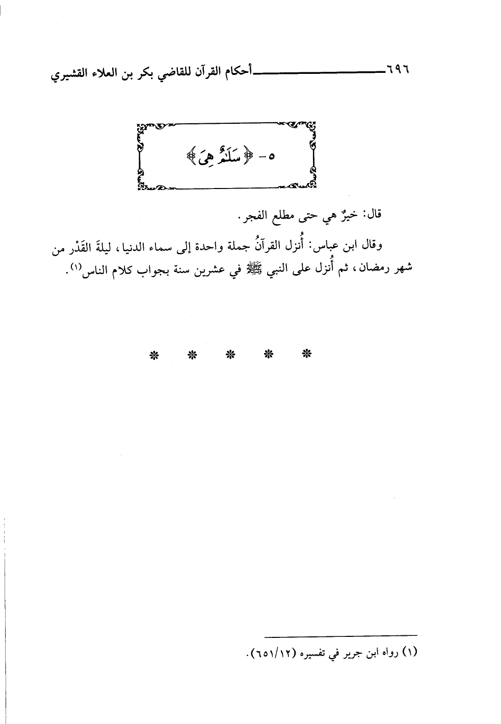 وقال ابن عباس: أُنزل القرآنُ جملة واحدة إلى سماء الدنيا، ليلةَ القَدْر من شهر رمضان، ثم أُنزل على النبي -صلى اللَّه عليه وسلم- في عشرين سنة بجواب كلام الناس (¬١).