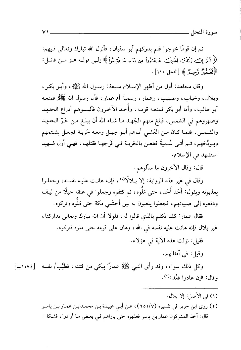 (¬٢) روى ابن جرير في تفسيره (٧/ ٦٥١)، عن أبي عبيدة بن محمد بن عمار بن ياسر قال: أخذ المشركون عمار بن ياسر فعذبوه حتى باراهم في بعض ما أرادوا، فشكا =