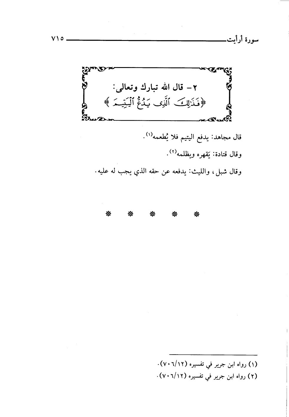 ٢ - قال اللَّه تبارك وتعالى: {فَذَلِكَ الَّذِي يَدُعُّ الْيَتِيمَ}
