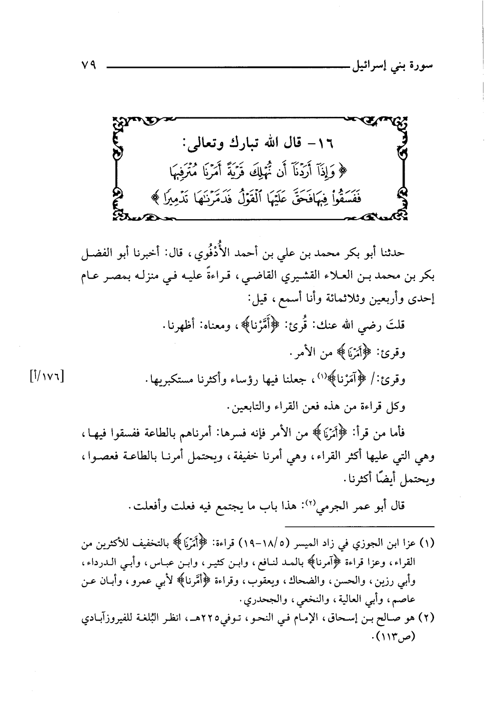 (¬١) عزا ابن الجوزي في زاد الميسر (٥/ ١٨ - ١٩) قراءة: {أَمَرْنَا} بالتخفيف للأكثرين من القراء، وعزا قراءة {آمرنا} بالمد لنافع، وابن كثير، وابن عباس، وأبي الدرداء، وأبي رزين، والحسن، والضحاك، ويعقوب، وقراءة {أمَّرنا} لأبي عمرو، وأبان عن عاصم، وأبي العالية، والنخعي، والجحدري.