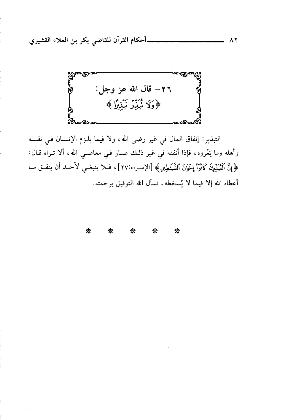 ٢٦ - قال اللَّه عز وجل: {وَلَا تُبَذِّرْ تَبْذِيرًا}