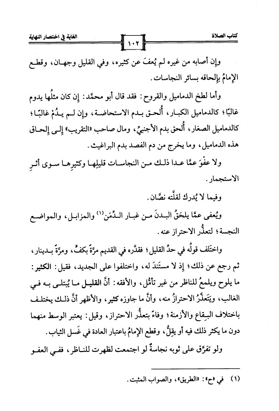 واختَلف قولُه في حدِّ القليل؛ فقدَّره في القديم مرَّةَ بكفٍّ، ومرَّةً بدينار، ثم رجع عن ذلك؛ إِذ لا مستَندَ له، واختلفوا على الجديد، فقيل: الكثير: ما يلوح ويلمعُ للناظر من غير تأمُّل، والأفقه: أنَّ القليل ما يُبتلى به في الغالب، ويَتَعذَّرُ الاحترازُ منه، وأنَّ ما جاوزه كثير، والأظهر أنَّ ذلك يختلف باختلاف البِقاع والأزمنة؛ وفاءً بتعذُّر الاحتراز، وقيل: يعتبر الوسط منهما دون ما يكثر ذلك فيه أو يقِلُّ، وقطع الإِمامُ باعتبار العادة في غَسل الثياب.