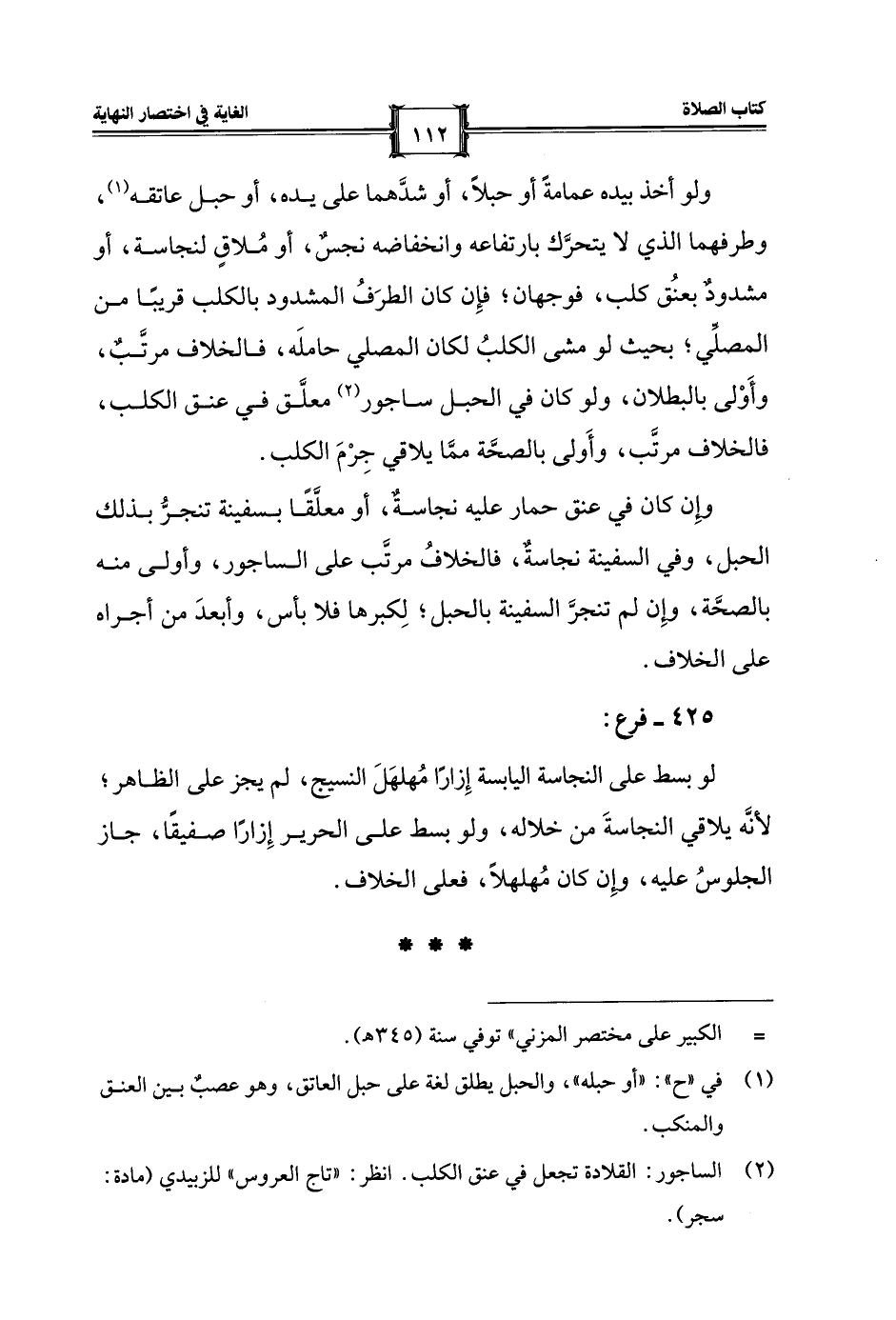 ولو أخذ بيده عمامةً أو حبلًا، أو شدَّهما على يده، أو حبل عاتقه (¬1)، وطرفهما الذي لا يتحرَّك بارتفاعه وانخفاضه نجسٌ، أو مُلاقٍ لنجاسة، أو مشدودٌ بعنُق كلب، فوجهان؛ فإِن كان الطرَفُ المشدود بالكلب قريبًا من المصلِّي؛ بحيث لو مشى الكلبُ لكان المصلي حاملَه، فالخلاف مرتَّبٌ، وأَوْلى بالبطلان، ولو كان في الحبل ساجور (¬2) معلَّق في عنق الكلب، فالخلاف مرتَّب، وأَولى بالصحَّة ممَّا يلاقي جِرْمَ الكلب.