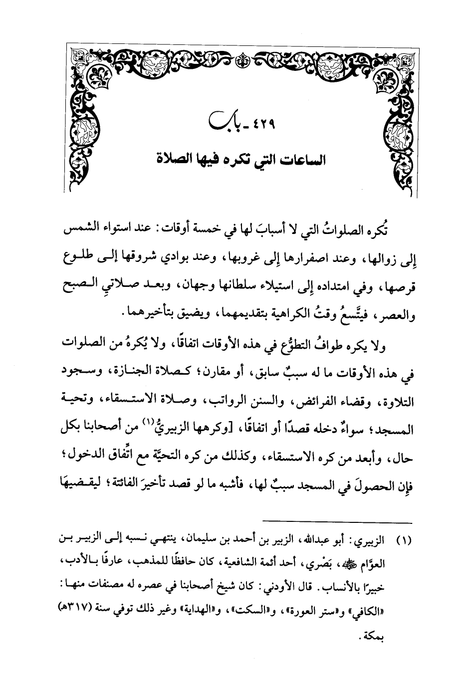 (¬1) الزبيري: أبو عبد الله، الزبير بن أحمد بن سليمان، ينتهي نسبه إلى الزبير بن العوَّام - رضي الله عنه -، بَصْري، أحد أئمة الشافعية، كان حافظًا للمذهب، عارفًا بالأدب، خبيرًا بالأنساب. قال الأودني: كان شيخ أصحابنا في عصره له مصنفات منها: "الكافي" و"ستر العورة"، و "السكت"، و "الهداية" وغير ذلك توفي سنة (317 هـ) بمكة.