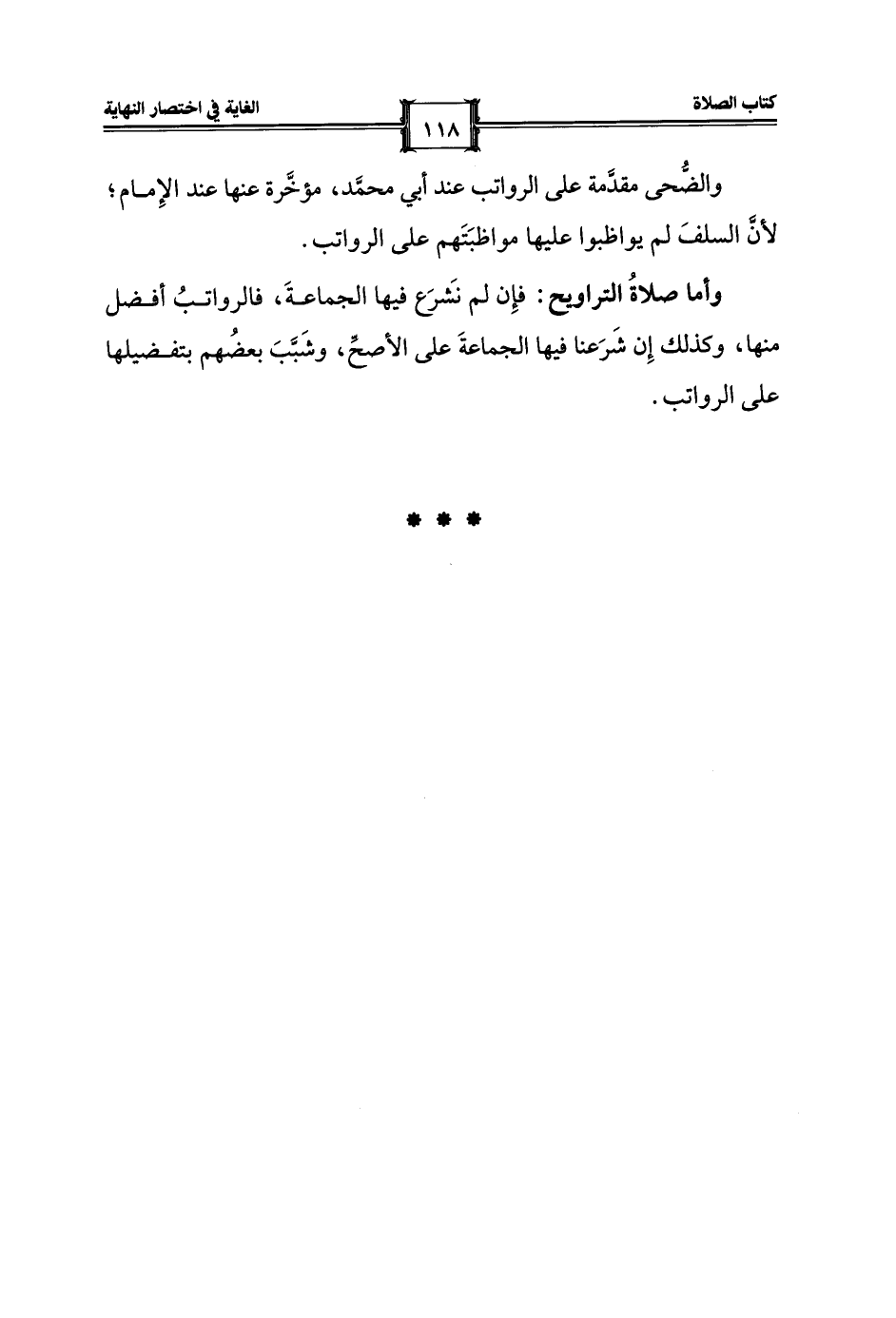 والضُّحى مقدَّمة على الرواتب عند أبي محمَّد، مؤخَّرة عنها عند الإِمام؛ لأن السلفَ لم يواظبوا عليها مواظبَتَهم على الرواتب.