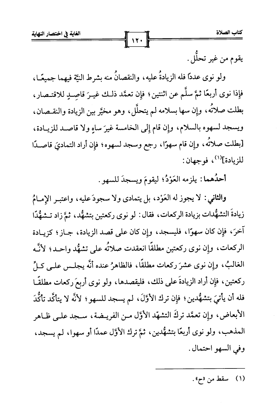 والثاني: لا يجوز له العَوْد، بل يتمادى ولا سجودَ عليه، واعتبر الإِمامُ زيادةَ التشهُّدات بزيادة الركعات، فقال: لو نوى ركعتين بتشهُّد، ثمَّ زاد تشهُّدًا آخرَ، فإِن كان سهوًا، فليسجد، وإِن كان على قصد الزيادة، جاز؛ كزيادة الركعات، وإِن نوى ركعتين مطلقًا انعقدت صلاتُه على تشهُّد واحد؛ لأنَّه الغالبُ، وإِن نوى عشرَ ركعات مطلقًا، فالظاهرُ عنده أنَّه يجلس على كلِّ ركعتين، فإِن أراد الزيادةَ على ذلك، فليقصدها، ولو نوى أربعَ ركعات مطلقًا فله أن يأتيَ بتشهُّدين؛ فإِن ترك الأوَّلَ، لم يسجد للسهو؛ لأنَّه لا يتأكَّد تأكُّدَ الأبعاض، وإِن تعمَّد تركَ التشهّد الأوَّل من الفريضة، سجد على ظاهر المذهب، ولو نوى أربعًا بتشهُّدين، ثمَّ ترك الأوَّل عمدًا أو سهوا، لم يسجد، وفي السهو احتمال.