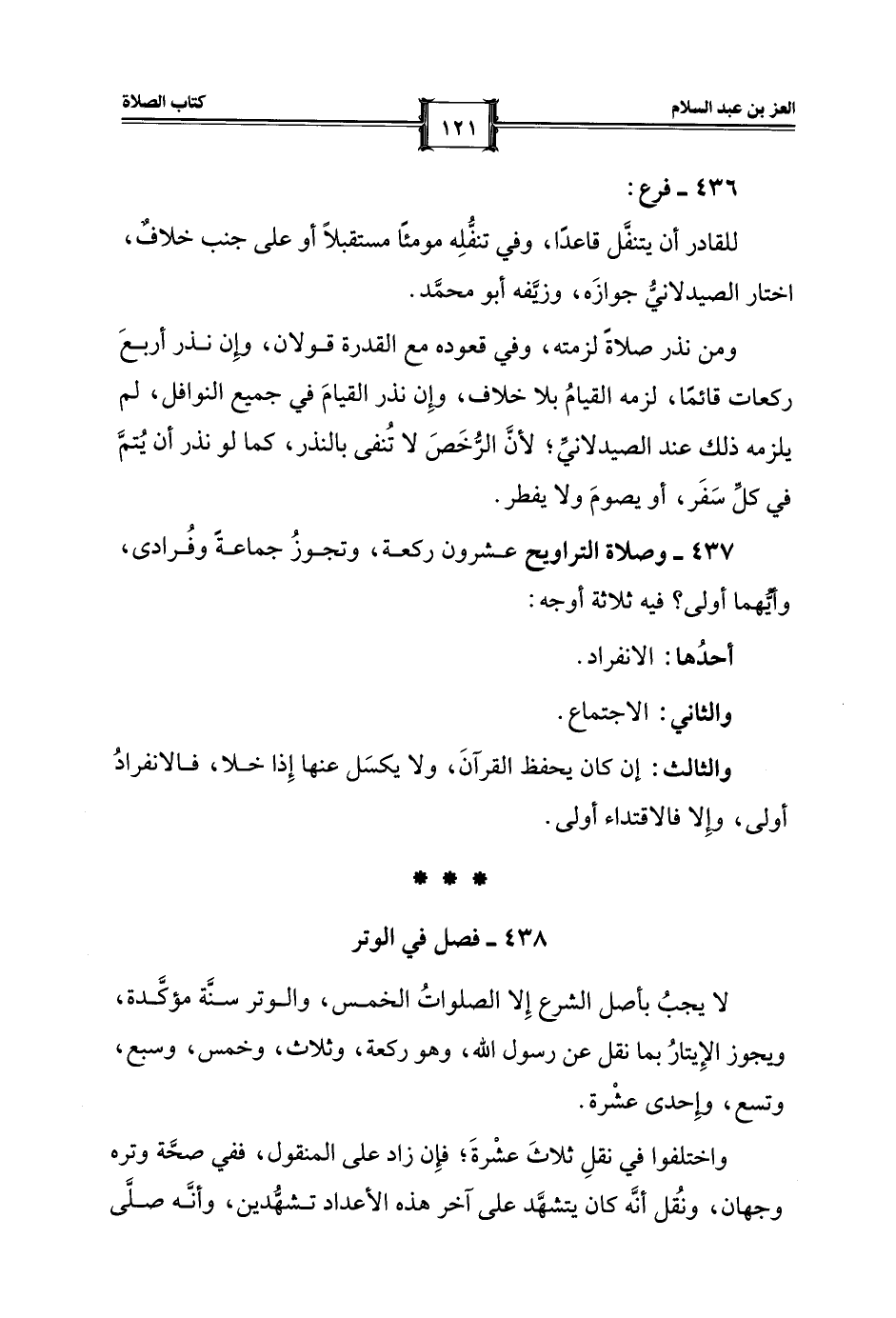 437 - وصلاة التراويح عشرون ركعة، وتجوزُ جماعة وفُرادى، وأيُّهما أولى؟ فيه ثلاثة أوجه: