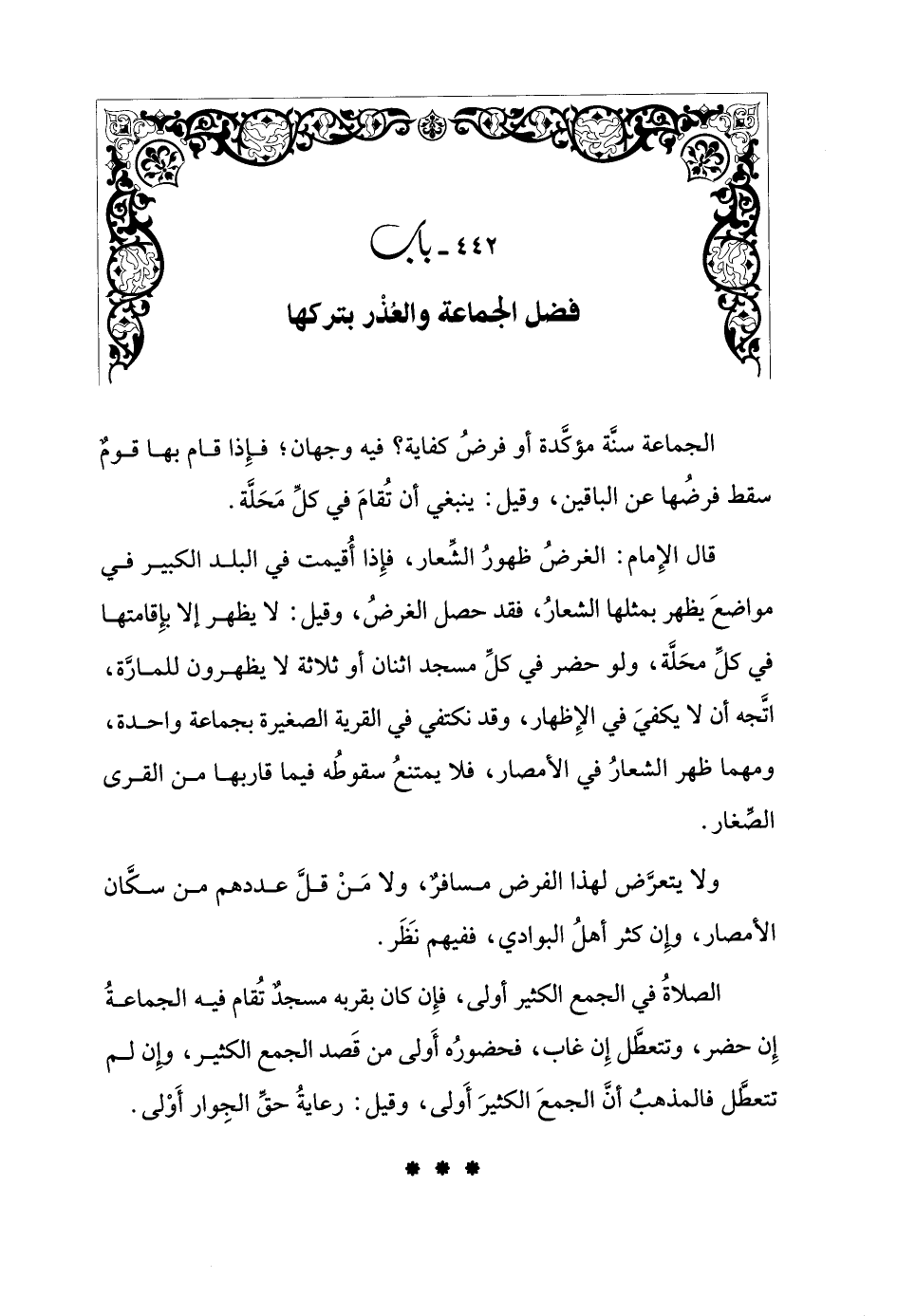 الصلاةُ في الجمع الكثير أولى، فإِن كان بقربه مسجدٌ تُقام فيه الجماعةُ إِن حضر، وتتعطَّل إِن غاب، فحضورُه أَولى من قَصد الجمع الكثير، وإِن لم تتعطَّل فالمذهبُ أنَّ الجمعَ الكثيرَ أَولى، وقيل: رعايةُ حقِّ الجِوار أَوْلى.