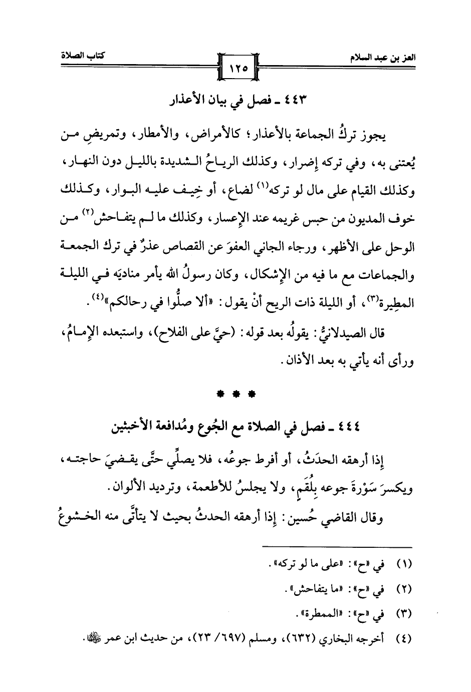 يجوز تركُ الجماعة بالأعذار؛ كالأمراض، والأمطار، وتمريضِ من يُعتنى به، وفي تركه إِضرار، وكذلك الرياحُ الشديدة بالليل دون النهار، وكذلك القيام على مال لو تركه (¬1) لضاع، أو خِيف عليه البوار، وكذلك خوف المديون من حبس غريمه عند الإِعسار، وكذلك ما لم يتفاحش (¬2) من الوحل على الأظهر، ورجاء الجاني العفوَ عن القصاص عذرٌ في ترك الجمعة والجماعات مع ما فيه من الإِشكال، وكان رسولُ الله يأمر مناديَه في الليلة المطِيرة (¬3)، أو الليلة ذات الريح أنْ يقول: "ألا صلُّوا في رحالكم" (¬4).