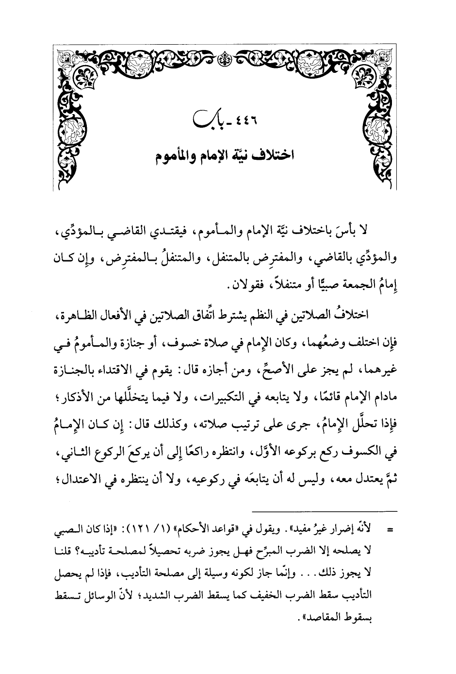 لا بأسَ باختلاف نيَّة الإمام والمأموم، فيقتدي القاضي بالمؤدِّي، والمؤدِّي بالقاضي، والمفترِض بالمتنفل، والمتنفلُ بالمفترِض، وإِن كان إِمامُ الجمعة صبيًّا أو متنفلًا، فقولان.