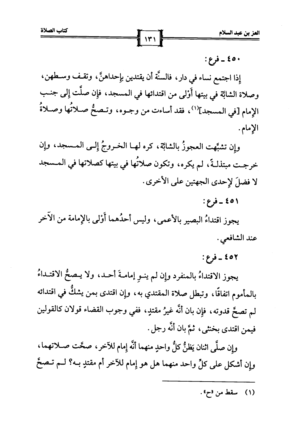 إِذا اجتمع نساء في دار، فالسنَّة أن يقتدين بإحداهنَّ، وتقف وسطهن، وصلاة الشابَّة في بيتها أَوْلى من اقتدائها في المسجد، فإِن صلَّت إِلى جنب الاِمام [في المسجد] (¬1)، فقد أساءت من وجوه، وتصحُّ صلاتُها وصلاةُ الإِمام.