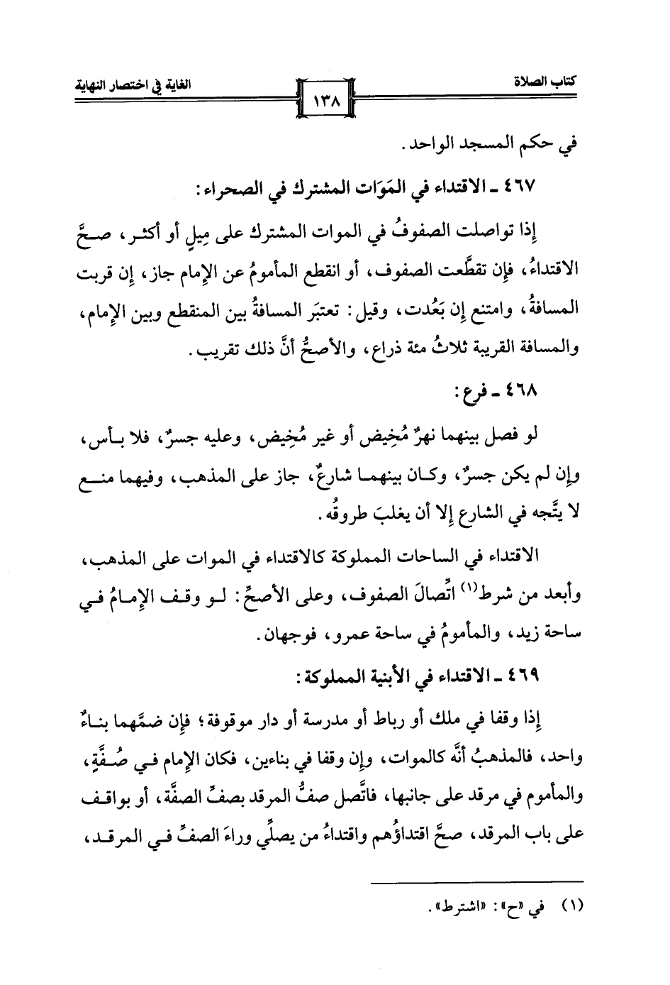 إِذا تواصلت الصفوفُ في الموات المشترك على مِيلٍ أو أكثر، صحَّ الاقتداءُ، فإن تقطعت الصفوف، أو انقطع المأمومُ عن الإِمام جاز، إِن قربت المسافةُ، وامتنع إِن بَعُدت، وقيل: تعتبَر المسافةُ بين المنقطع وبين الإِمام، والمسافة القريبة ثلاثُ مئة ذراع، والأصحُّ أن ذلك تقريب.