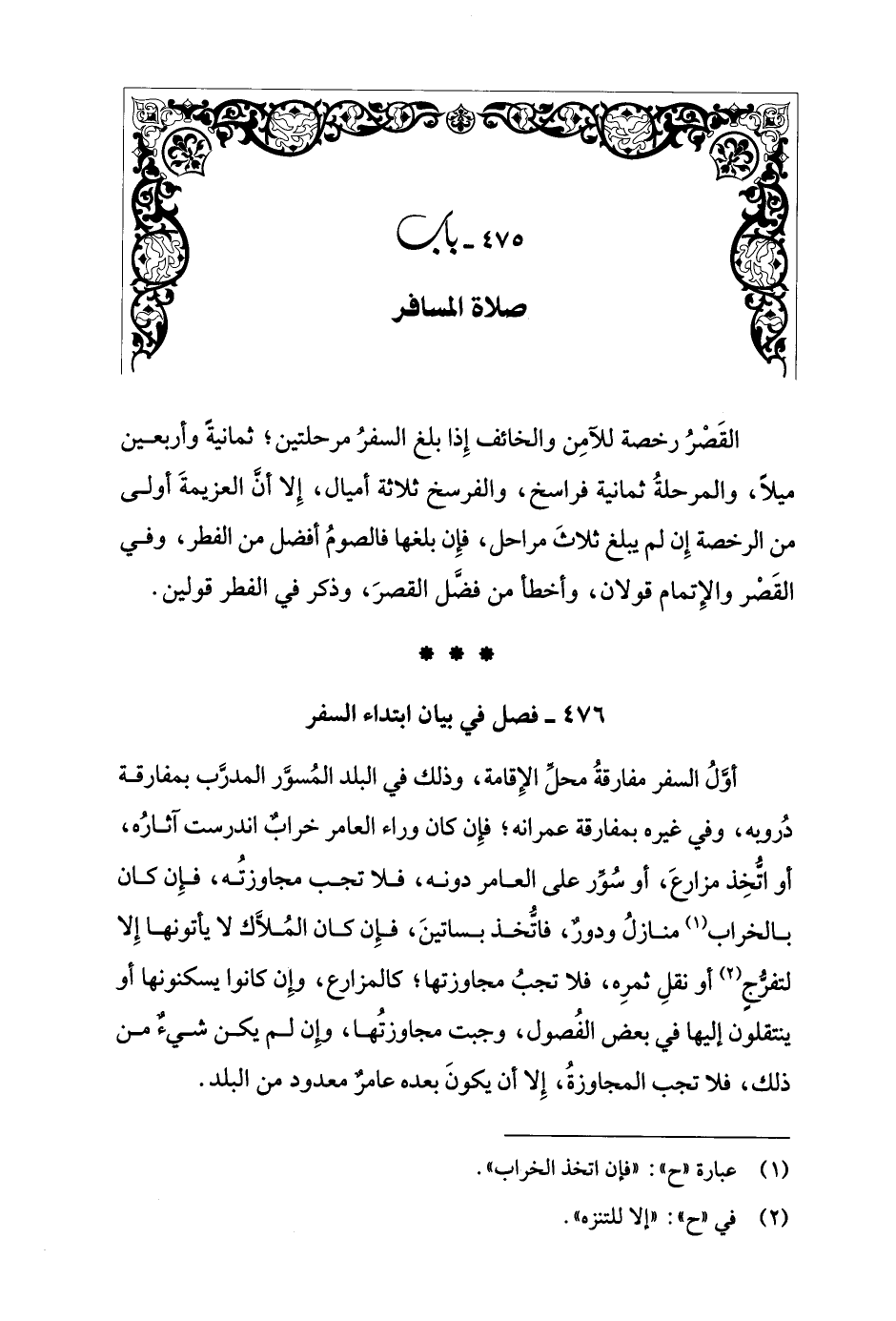 القَصْرُ رخصة للآمِن والخائف إِذا بلغ السفرُ مرحلتين؛ ثمانيةً وأربعين ميلًا، والمرحلةُ ثمانية فراسخ، والفرسخ ثلاثة أميال، إِلا أنَّ العزيمةَ أولى من الرخصة إِن لم يبلغ ثلاثَ مراحل، فإن بلغها فالصومُ أفضل من الفطر، وفي القَصْر والإِتمام قولان، وأخطأ من فضَّل القصرَ، وذكر في الفطر قولين.