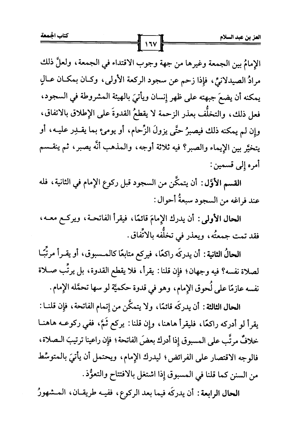الإمامُ بين الجمعة وغيرها من جهة وجوب الاقتداء في الجمعة، ولعلَّ ذلك مرادُ الصيدلانيِّ، فإِذا زحم عن سجود الركعة الأولى، وكان بمكان عالٍ يمكنه أنَّ يضعَ جبهته على ظهر إِنسان ويأتيَ بالهيئة المشروطة في السجود، فعل ذلك، والتخلُّف بعذر الزحمة لا يقطعُ القدوةَ على الإِطلاق بالاتفاق، وإِن لم يمكنه ذلك فيصبرُ حتَّى يزولَ الزِّحام، أو يومئ بما يقدِر عليه، أو يتخير بين الإِيماء والصبر؟ فيه ثلاثة أوجه، والمذهب أنَّه يصبر، ثم ينقسم أمره إِلى قسمين: