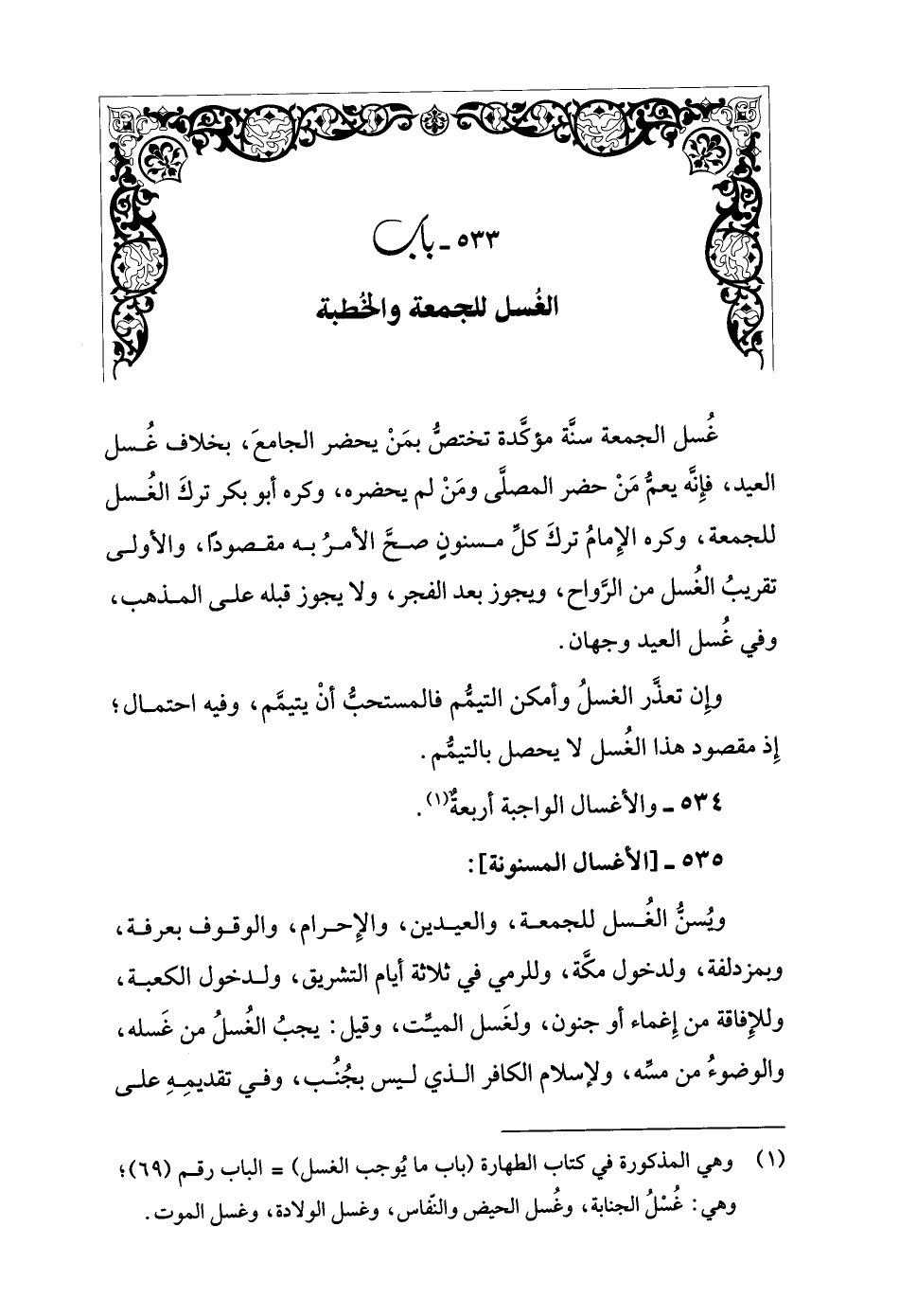 غُسل الجمعة سنَّة مؤكَّدة تختصُّ بمَنْ يحضر الجامعَ، بخلاف غُسل العيد، فإِنَّه يعمُّ مَنْ حضر المصلَّى ومَنْ لم يحضره، وكره أبو بكر تركَ الغُسل للجمعة، وكره الإِمامُ تركَ كلِّ مسنونٍ صحَّ الأمرُ به مقصودًا، والأولى تقريبُ الغُسل من الرَّواح، ويجوز بعد الفجر، ولا يجوز قبله على المذهب، وفي غُسل العيد وجهان.