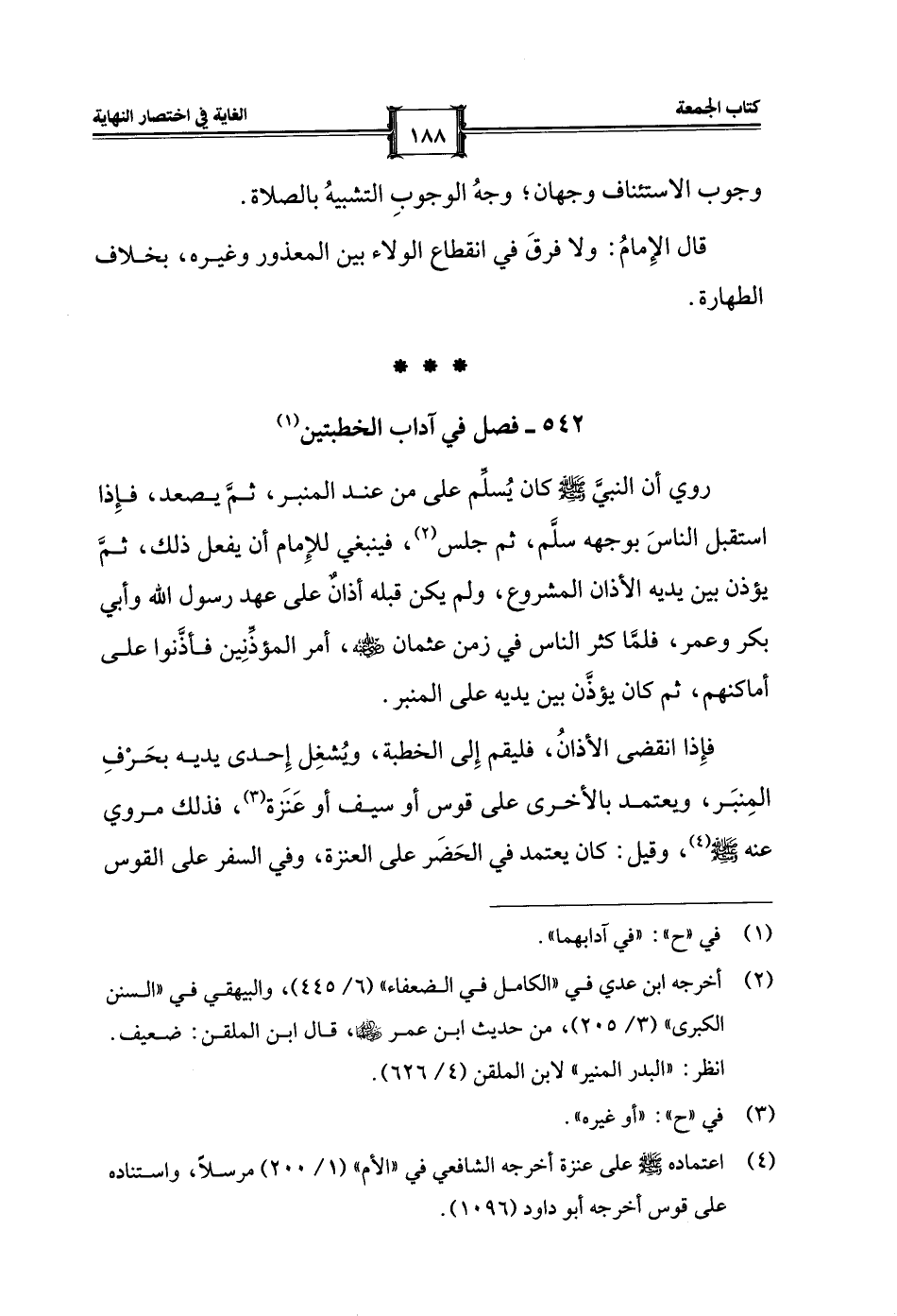فإِذا انقضى الأذانُ، فليقم إِلى الخطبة، ويُشغِل إِحدى يديه بحَرْفِ المِنبَر، ويعتمد بالأخرى على قوس أو سيف أو عَنَزة (¬3)، فذلك مروي عنه - صلى الله عليه وسلم - (¬4)، وقيل: كان يعتمد في الحَضَر على العنزة، وفي السفر على القوس