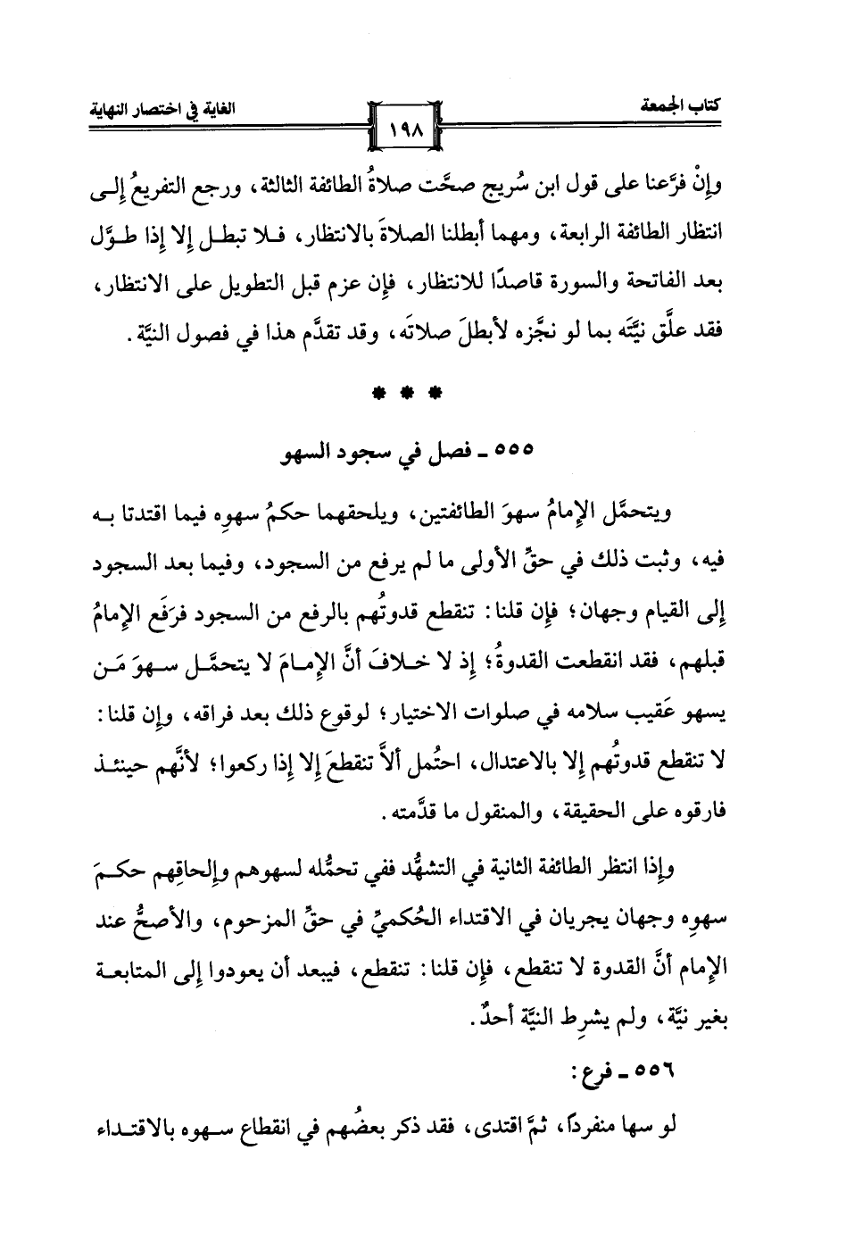ويتحمَّل الإِمامُ سهوَ الطائفتين، ويلحقهما حكمُ سهوِه فيما اقتدتا به فيه، وثبت ذلك في حقِّ الأولى ما لم يرفع من السجود، وفيما بعد السجود إِلى القيام وجهان؛ فإِن قلنا: تنقطع قدوتُهم بالرفع من السجود فرَفَع الإِمامُ قبلهم، فقد انقطعت القدوةُ؛ إِذ لا خلافَ أنَّ الإِمامَ لا يتحمَّل سهوَ مَن يسهو عَقيب سلامه في صلوات الاختيار؛ لوقوع ذلك بعد فراقه، وإن قلنا: لا تنقطع قدوتُهم إِلا بالاعتدال، احتُمل ألَّا تنقطعَ إِلا إِذا ركعوا؛ لأنَّهم حينئذ فارقوه على الحقيقة، والمنقول ما قدَّمته.