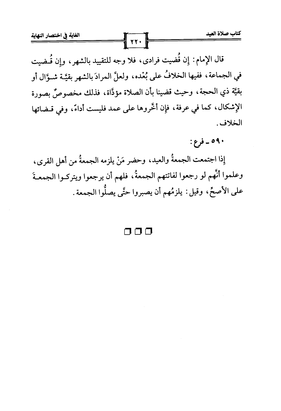 قال الإِمام: إِن قُضيت فرادى، فلا وجه للتقييد بالشهر، وإِن قُضيت في الجماعة، ففيها الخلافُ على بُعْده، ولعلَّ المرادَ بالشهر بقيَّة شوَّال أو بقيَّة ذي الحجة، وحيث قضينا بأن الصلاة مؤدَّاة، فذلك مخصوصٌ بصورة الإِشكال، كما في عرفة، فإِن أخَّروها على عمد فليست أداءً، وفي قضائها الخلاف.