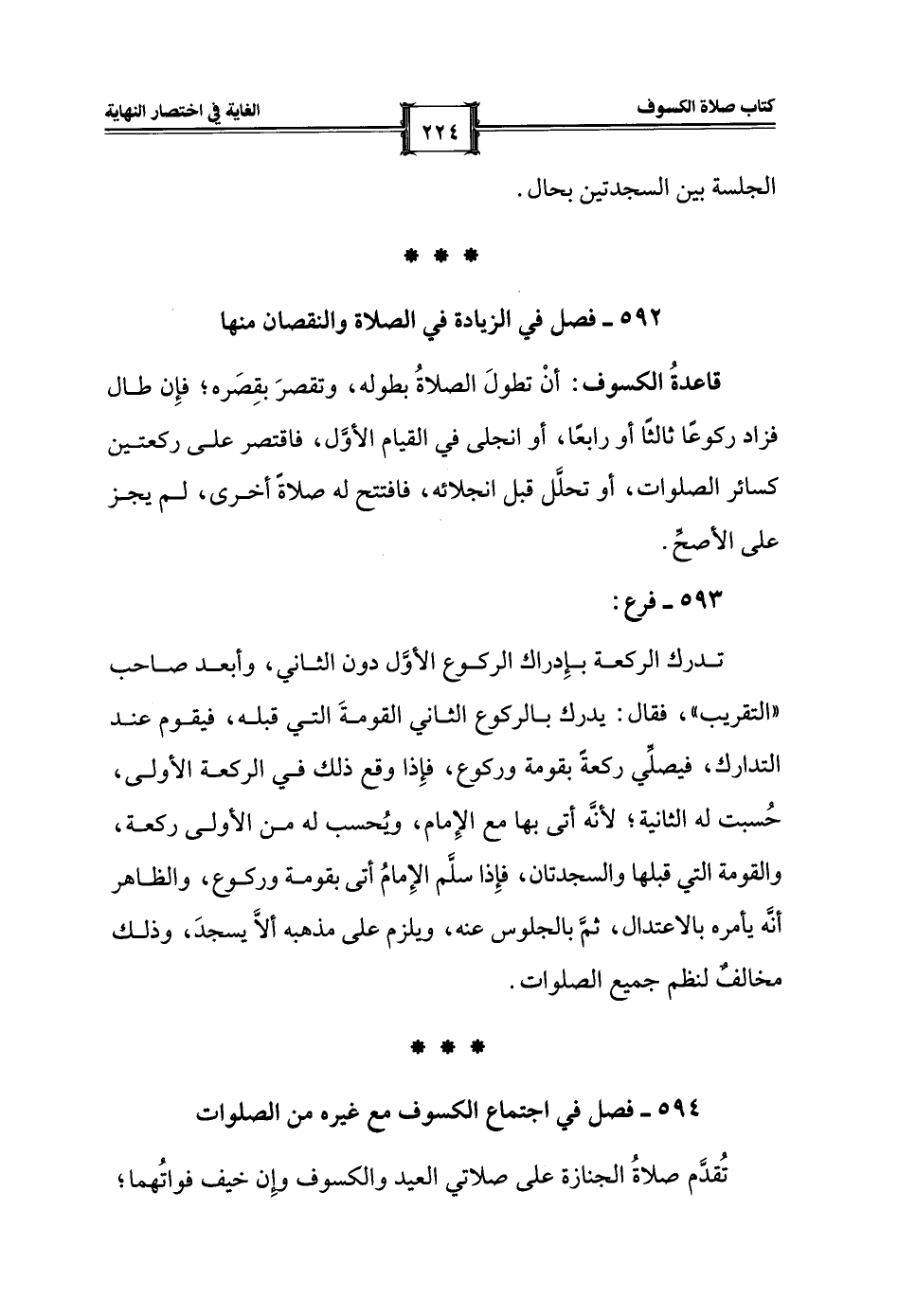 قاعدةُ الكسوف: أنْ تطولَ الصلاةُ بطوله، وتقصرَ بقِصَره؛ فإِن طال فزاد ركوعًا ثالثًا أو رابعًا، أو انجلى في القيام الأوَّل، فاقتصر على ركعتين كسائر الصلوات، أو تحلَّل قبل انجلائه، فافتتح له صلاةً أخرى، لم يجز على الأصحِّ.