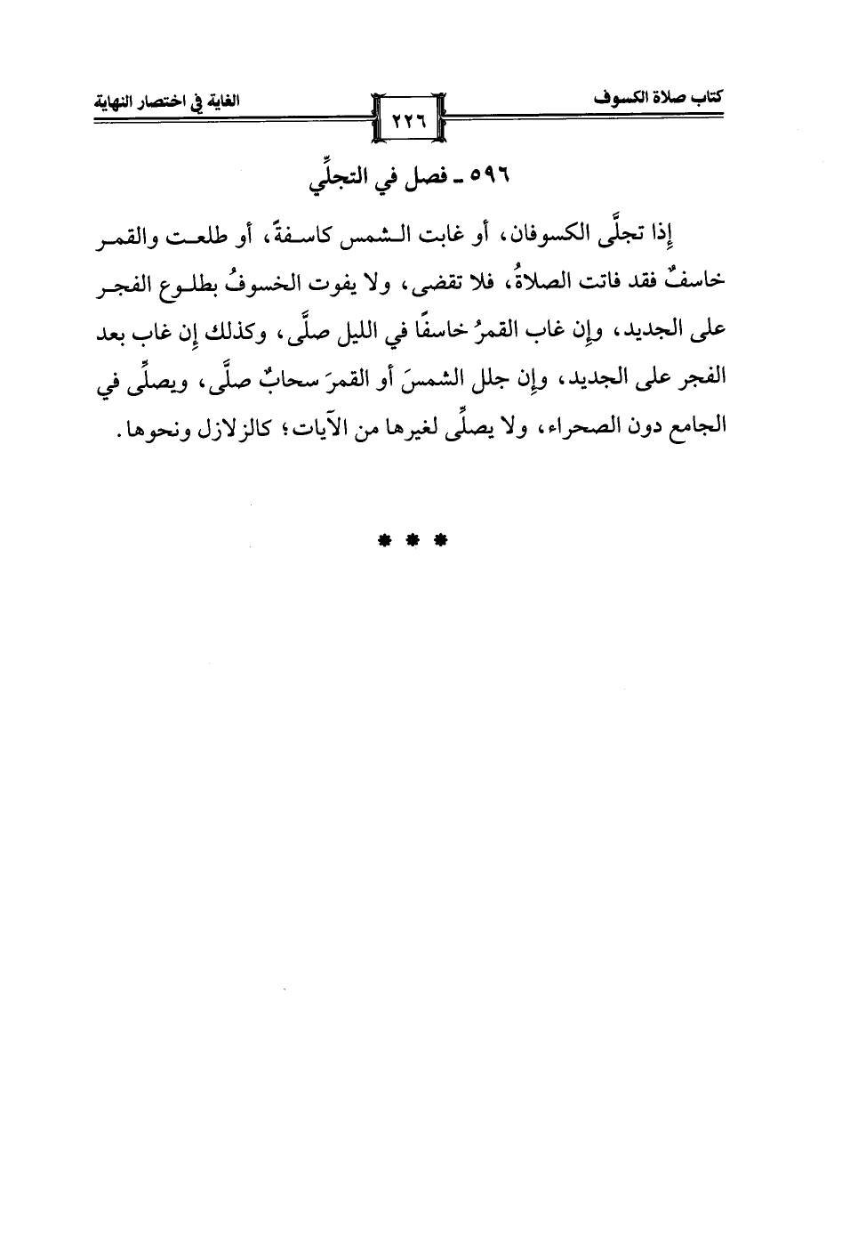 إِذا تجلَّى الكسوفان، أو غابت الشمس كاسفةً، أو طلعت والقمر خاسفٌ فقد فاتت الصلاةُ، فلا تقضى، ولا يفوت الخسوفُ بطلوع الفجر على الجديد، وإِن غاب القمرُ خاسفًا في الليل صلَّى، وكذلك إِن غاب بعد الفجر على الجديد، وإِن جلل الشمسَ أو القمرَ سحابٌ صلَّى، ويصلِّي في الجامع دون الصحراء، ولا يصلِّي لغيرها من الآيات؛ كالزلازل ونحوها.
