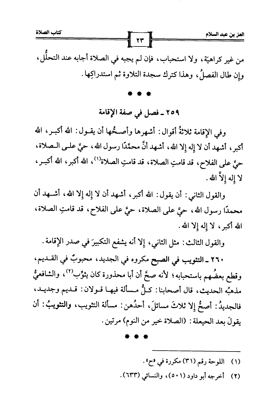 وفي الإِقامة ثلاثةُ أقوال: أشهرها وأصحُّها أن يقول: الله أكبر، الله أكبر، أشهد أن لا إِله إِلا الله، أشهد أنَّ محمَّدًا رسول الله، حيَّ على الصلاة، حيَّ على الفلاح، قد قامتِ الصلاة، قد قامتِ الصلاة (¬1)، الله أكبر، الله أكبر، لا إِله إِلَّا الله.
