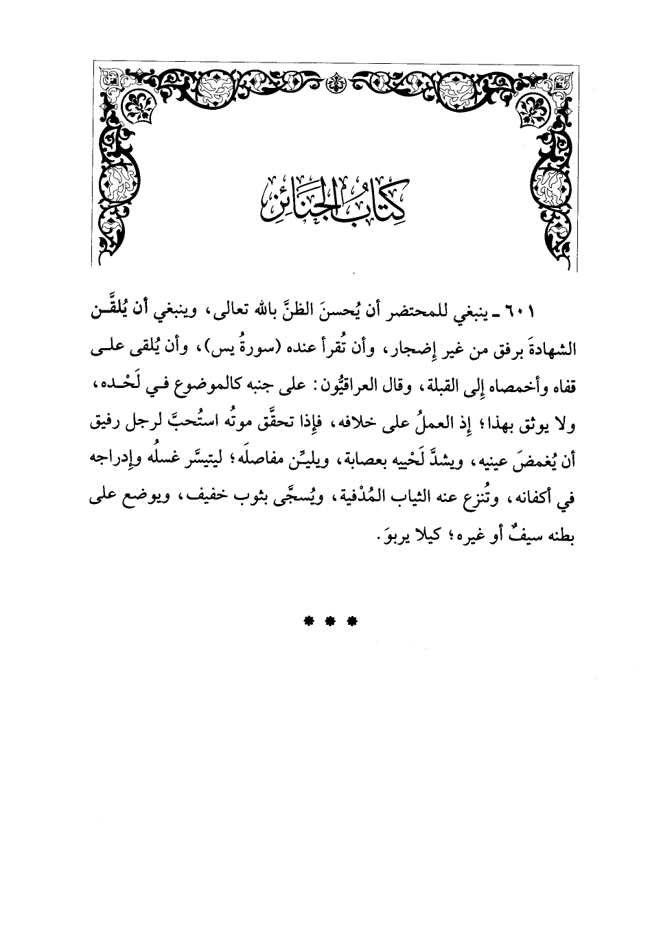 601 - ينبغي للمحتضر أن يُحسنَ الظنَّ بالله تعالى، وينبغي أن يُلقَّن الشهادةَ برفق من غير إِضجار، وأن تُقرأ عنده (سورةُ يس)، وأن يُلقى على قفاه وأخمصاه إِلى القبلة، وقال العراقيُّون: على جنبه كالموضوع في لَحْده، ولا يوثق بهذا؛ إِذ العملُ على خلافه، فإِذا تحقَّق موتُه استُحبَّ لرجل رفيق أن يُغمضَ عينيه، ويشدَّ لَحْييه بعصابة، ويليِّن مفاصلَه؛ ليتيسَّر غسلُه وإِدراجه في أكفانه، وتُنزع عنه الثياب المُدْفية، ويُسجَّى بثوب خفيف، ويوضع على بطنه سيفٌ أو غيره؛ كيلا يربوَ.
