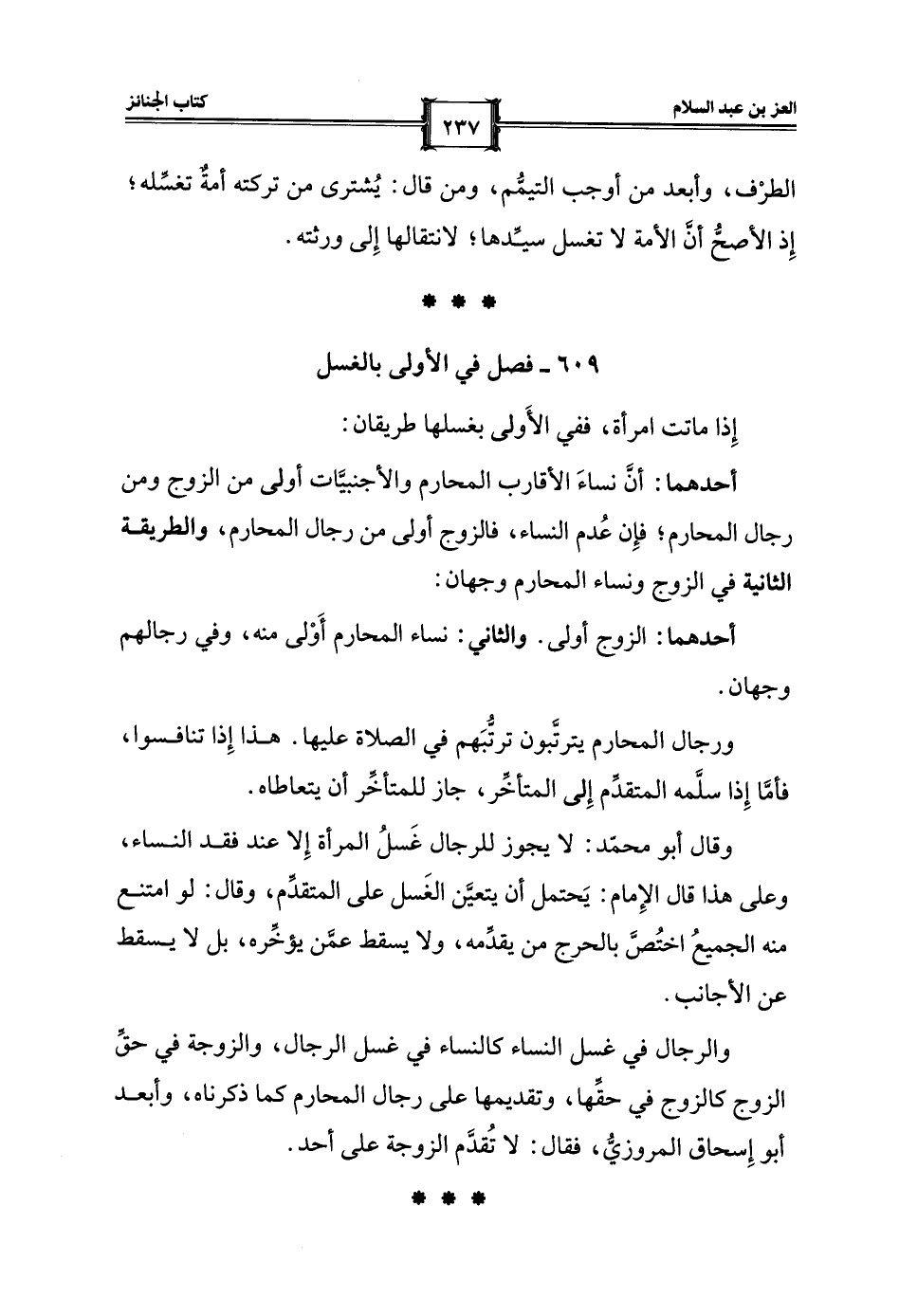 وقال أبو محمّد: لا يجوز للرجال غَسلُ المرأة إِلا عند فقد النساء، وعلى هذا قال الإِمام: يَحتمل أن يتعيَّن الغَسل على المتقدِّم، وقال: لو امتنع منه الجميعُ اختُصَّ بالحرج من يقدِّمه، ولا يسقط عمَّن يؤخِّره، بل لا يسقط عن الأجانب.