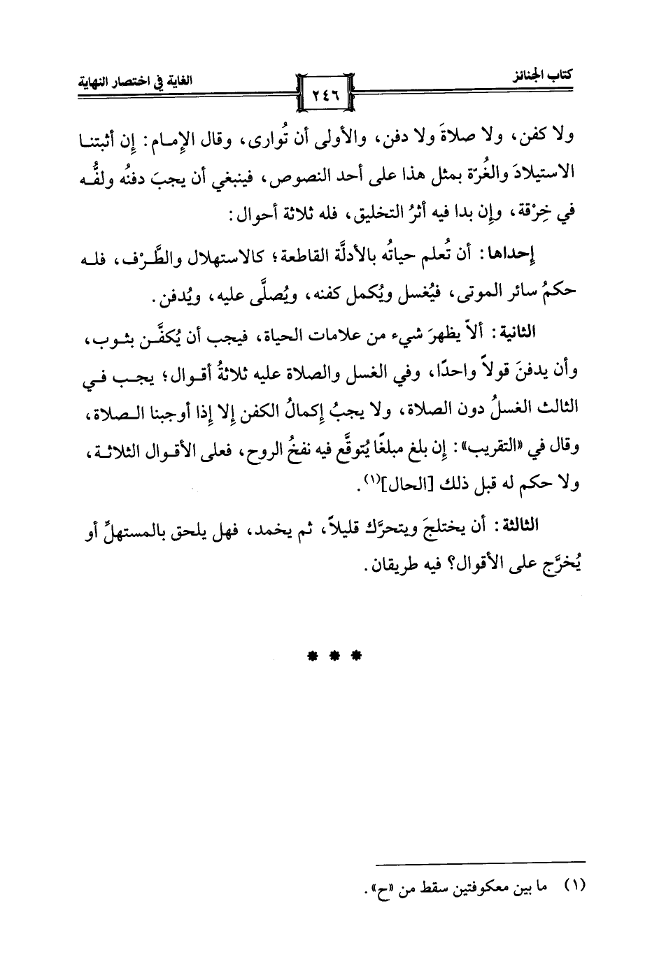 الثانية: ألّا يظهرَ شيء من علامات الحياة، فيجب أن يُكفَّن بثوب، وأن يدفنَ قولًا واحدًا، وفي الغسل والصلاة عليه ثلاثةُ أقوال؛ يجب في الثالث الغسلُ دون الصلاة، ولا يجبُ إِكمالُ الكفن إِلا إِذا أوجبنا الصلاة، وقال في "التقريب": إِن بلغ مبلغًا يُتوقَّع فيه نفخُ الروح، فعلى الأقوال الثلاثة، ولا حكم له قبل ذلك [الحال] (¬1).