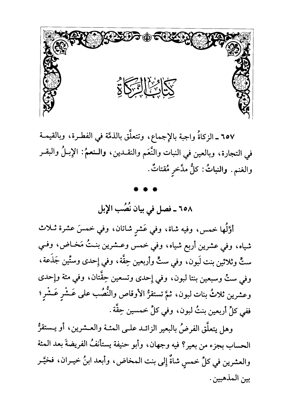 657 - الزكاةُ واجبة بالإِجماع، وتتعلَّق بالذمَّة في الفطرة، وبالقيمة في التجارة، وبالعين في النبات والنَّعَم والنقدين، والنعمُ: الإِبلُ والبقر والغنم. والنباتُ: كلُّ مدَّخرٍ مُقتاتٌ.