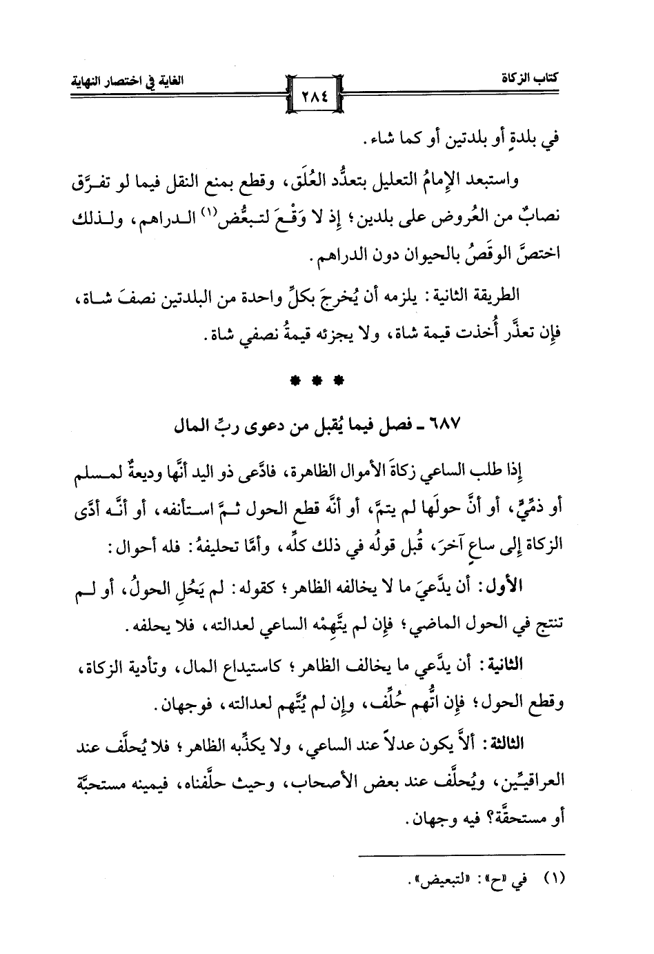 الأول: أن يدَّعيَ ما لا يخالفه الظاهر؛ كقوله: لم يَحُلِ الحولُ، أو لم تنتج في الحول الماضي؛ فإِن لم يتَّهِمْه الساعي لعدالته، فلا يحلفه.