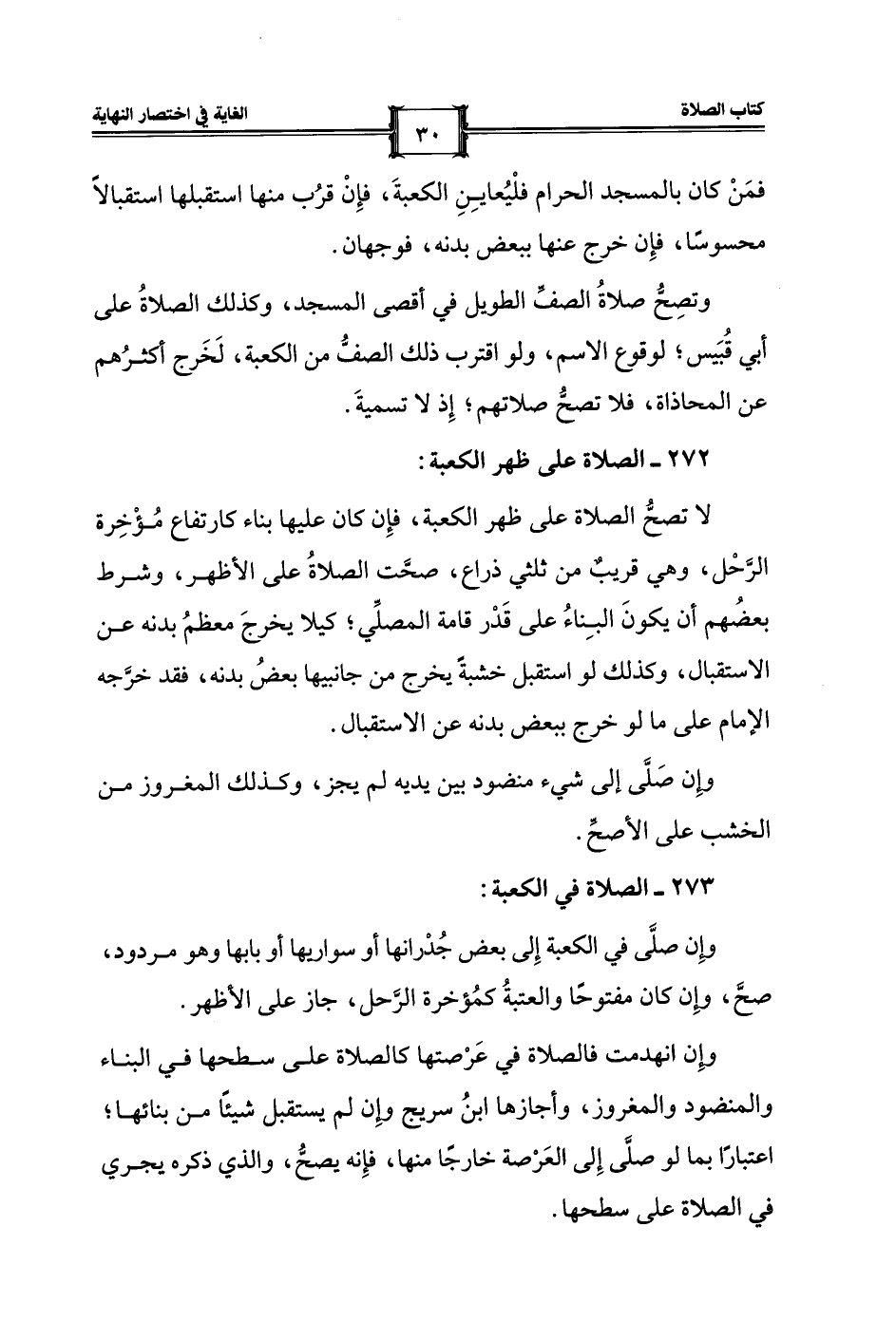لا تصحُّ الصلاة على ظهر الكعبة، فإِن كان عليها بناء كارتفاع مُؤْخِرة الرَّحْل، وهي قريبٌ من ثلثي ذراع، صحَّت الصلاةُ على الأظهر، وشرط بعضُهم أن يكونَ البِناءُ على قَدْر قامة المصلِّي؛ كيلا يخرجَ معظمُ بدنه عن الاستقبال، وكذلك لو استقبل خشبةً يخرج من جانبيها بعضُ بدنه، فقد خرَّجه الإمام على ما لو خرج ببعض بدنه عن الاستقبال.