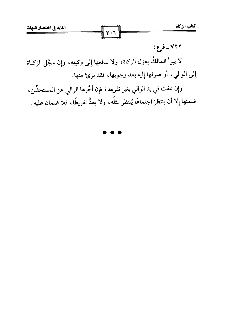 لا يبرأ المالكُ بعزل الزكاة، ولا بدفعها إِلى وكيله، وإِن عجَّل الزكاةَ إِلى الوالي، أو صرفها إِليه بعد وجوبها، فقد برئ منها.
