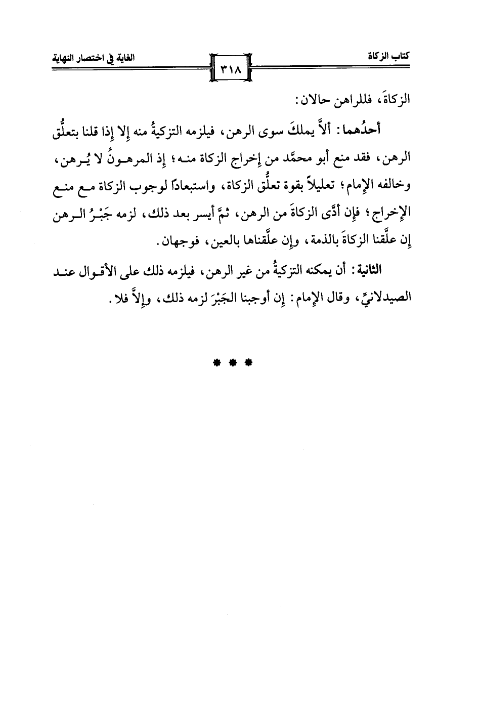 أحدُهما: ألَّا يملكَ سوى الرهن، فيلزمه التزكيةُ منه إِلا إِذا قلنا بتعلُّق الرهن، فقد منع أبو محمَّد من إِخراج الزكاة منه؛ إِذ المرهونُ لا يُرهن، وخالفه الإِمام؛ تعليلًا بقوة تعلُّق الزكاة، واستبعادًا لوجوب الزكاة مع منع الإِخراج؛ فإن أدَّى الزكاةَ من الرهن، ثمَّ أيسر بعد ذلك، لزمه جَبْرُ الرهن إِن علَّقنا الزكاةَ بالذمة، وإن علَّقناها بالعين، فوجهان.